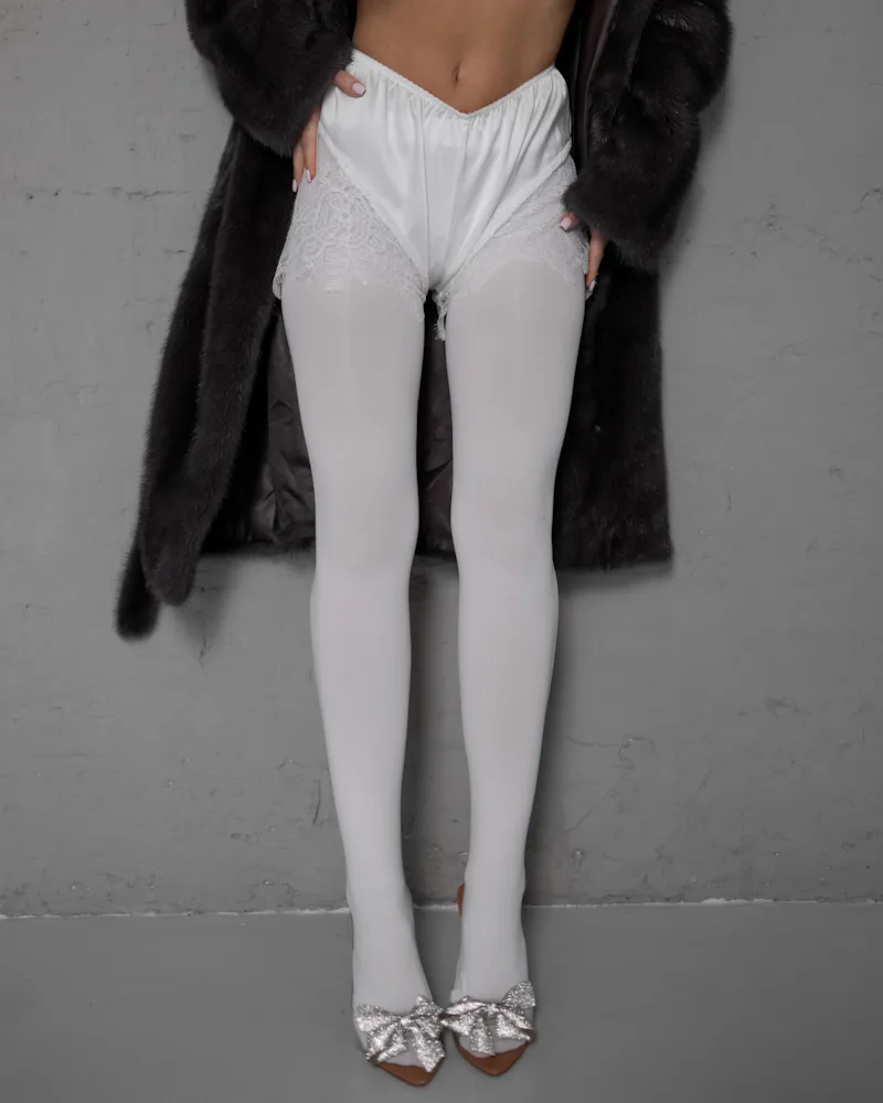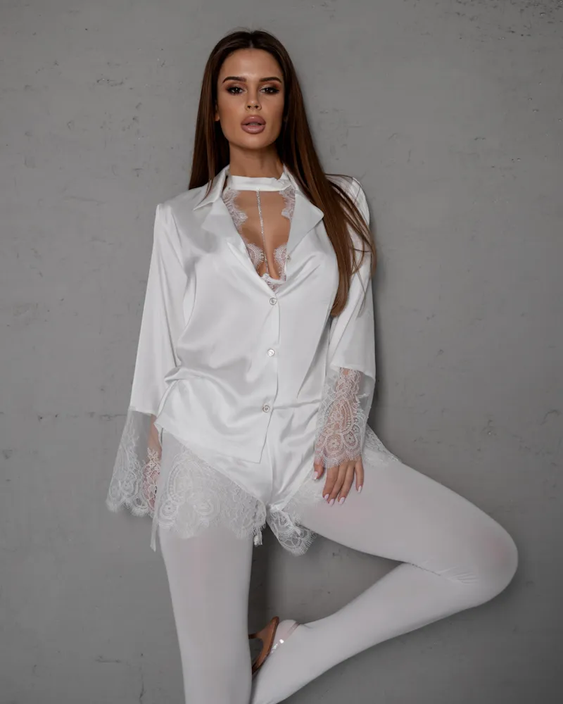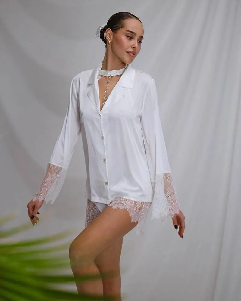 Піжамний костюм-трійка "Angelica" (сорочка+топ+шорти) шовк Армані та мереживо з ланцюжком Білий