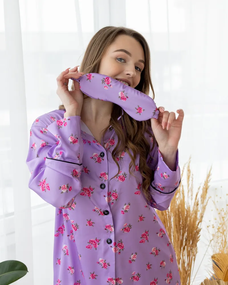 Повітряна сорочка на ґудзиках з високим манжетом та коміром, вільні штани на резинці із лампасами і комфортна маска для сну.