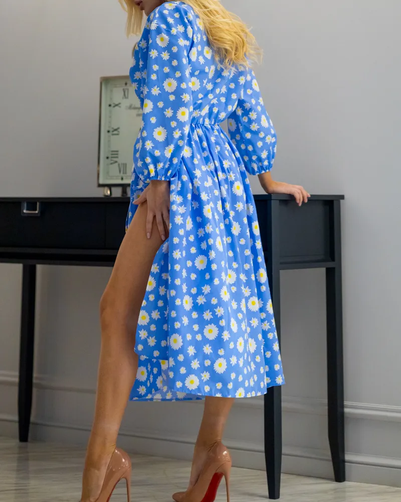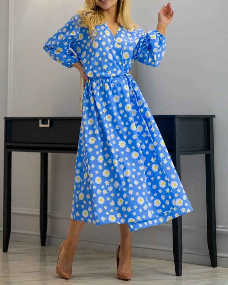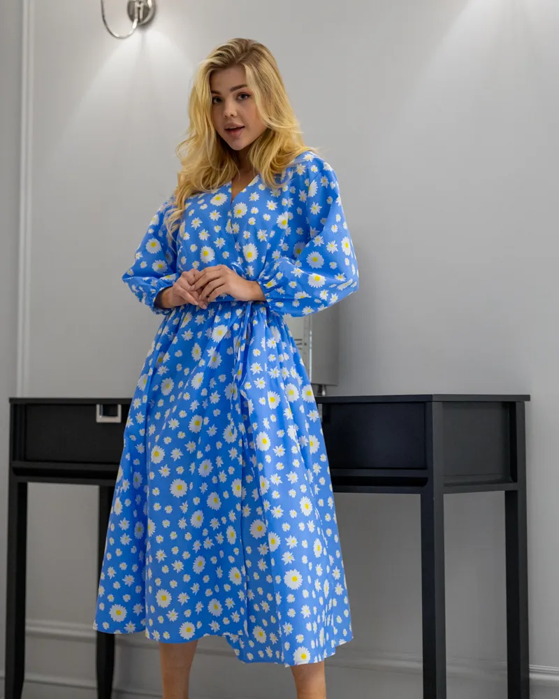 Яскрава та стильна сукня на запах вільного крою із довгими рукавами-ліхтариками на резинці.