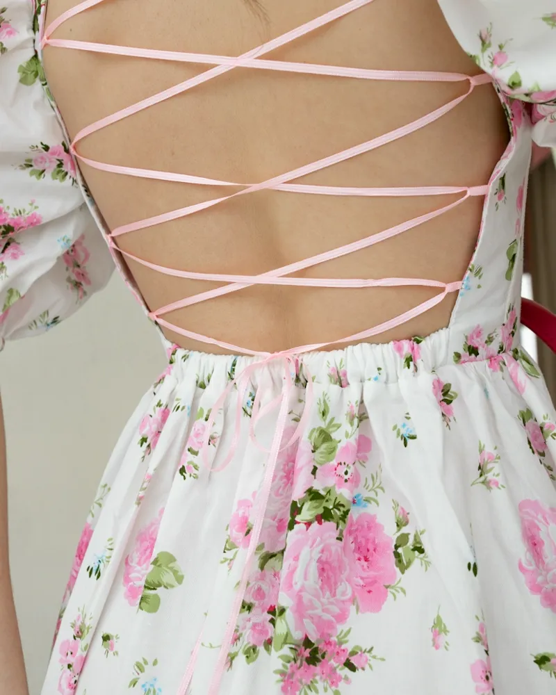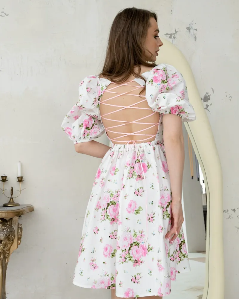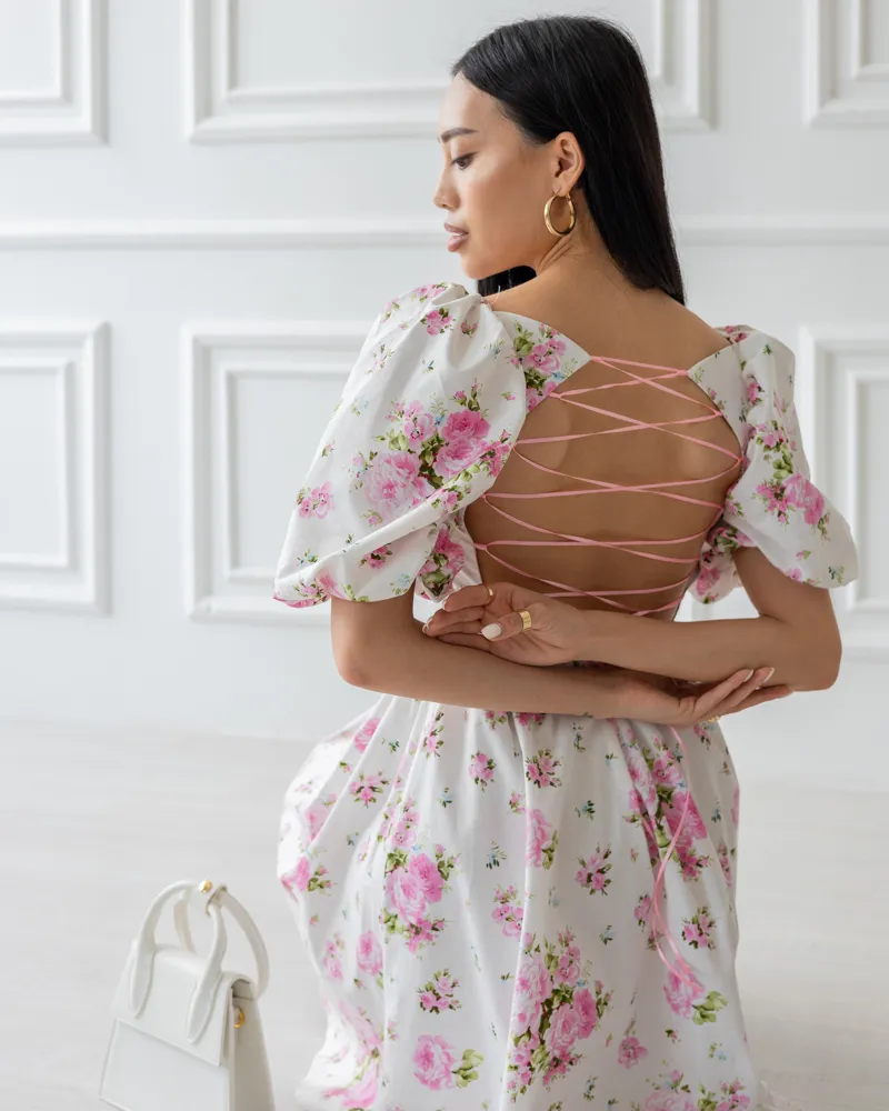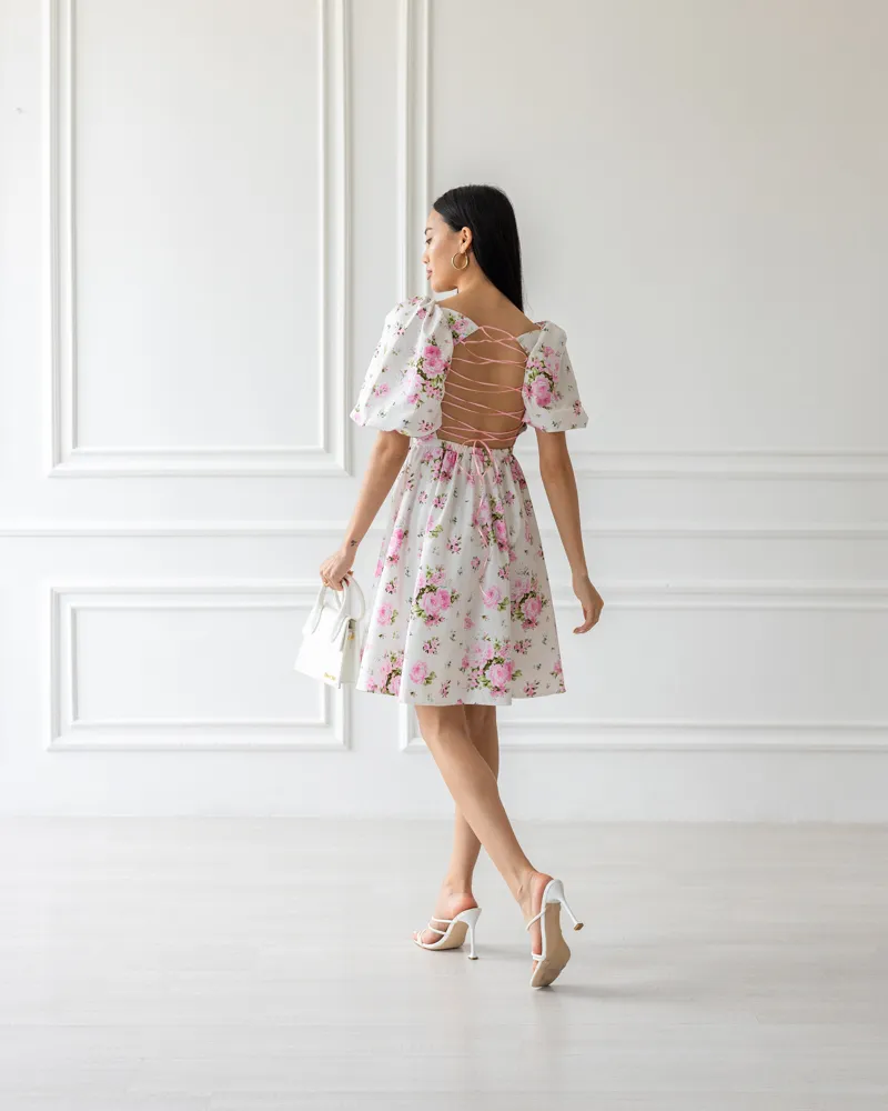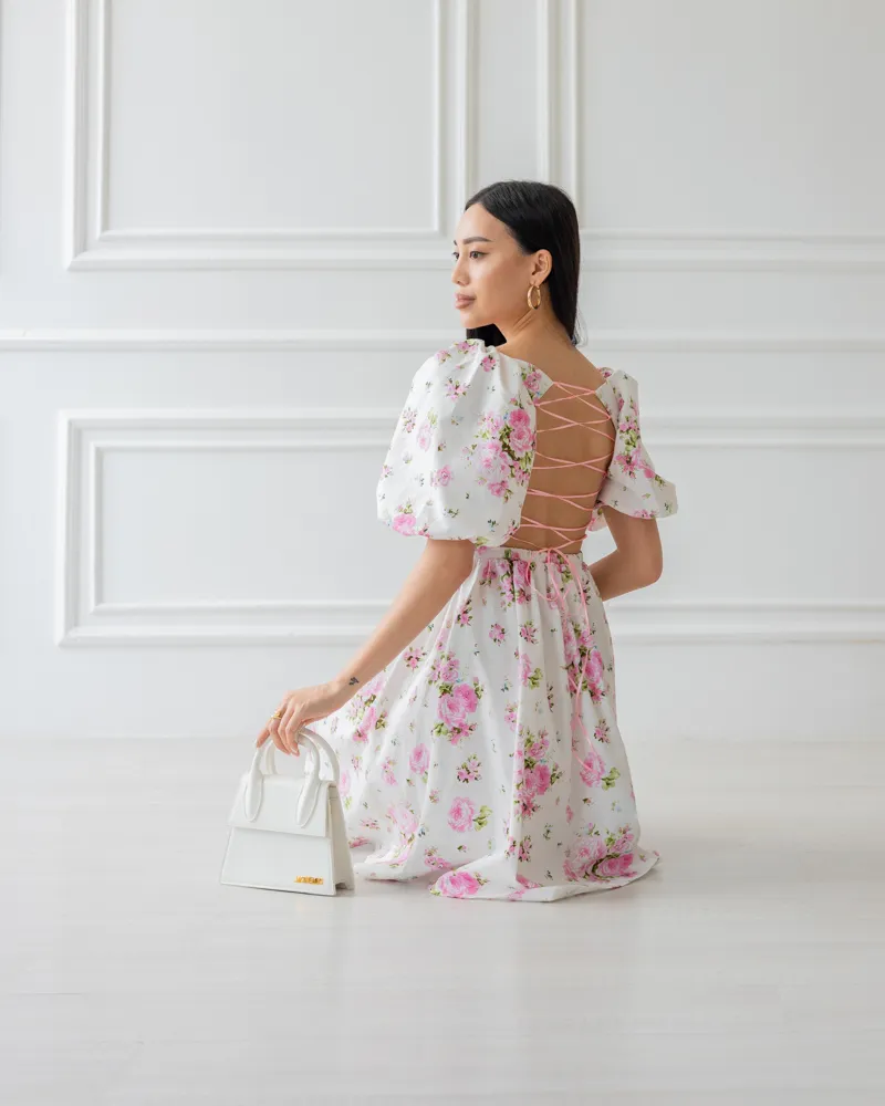Модель стилізована пишними рукавами-ліхтариками та тоненькою шнурівкою на спині, яка імітує корсет і підкреслює фігуру. Крій спідниці дозволяє почуватися вільно і підходить на будь-який обʼєм стегон.