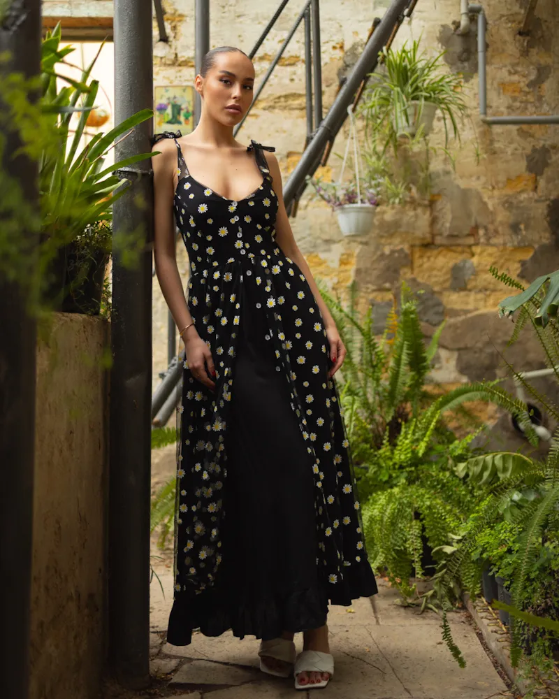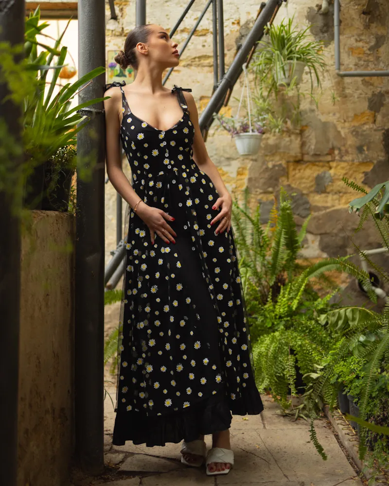 Модель зроблена на ґудзиках, на плечах зав'язки, спідниця має світлий легкий підклад, розріз якого можна регулювати на Ваш смак, низ внутрішнього підкладу оздоблений рюшами, зверху сітчаста тканина з принтом ромашка.