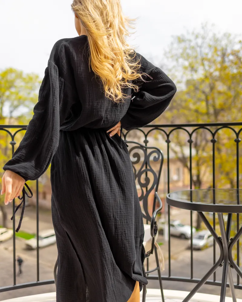 Повітряна сукня-міді із тканини муслін, яка така легка та невідчутна на тілі. Чудово пропускає повітря та дуже приємна на дотик.Модель зі спущеними рукавами-ліхтариками на манжетах із зав'язками, верх оздоблений ґудзиками. Резинка на талії підкреслить Вашу фігуру, а розрізи з обох боків зроблять образ ніжним та жіночним.