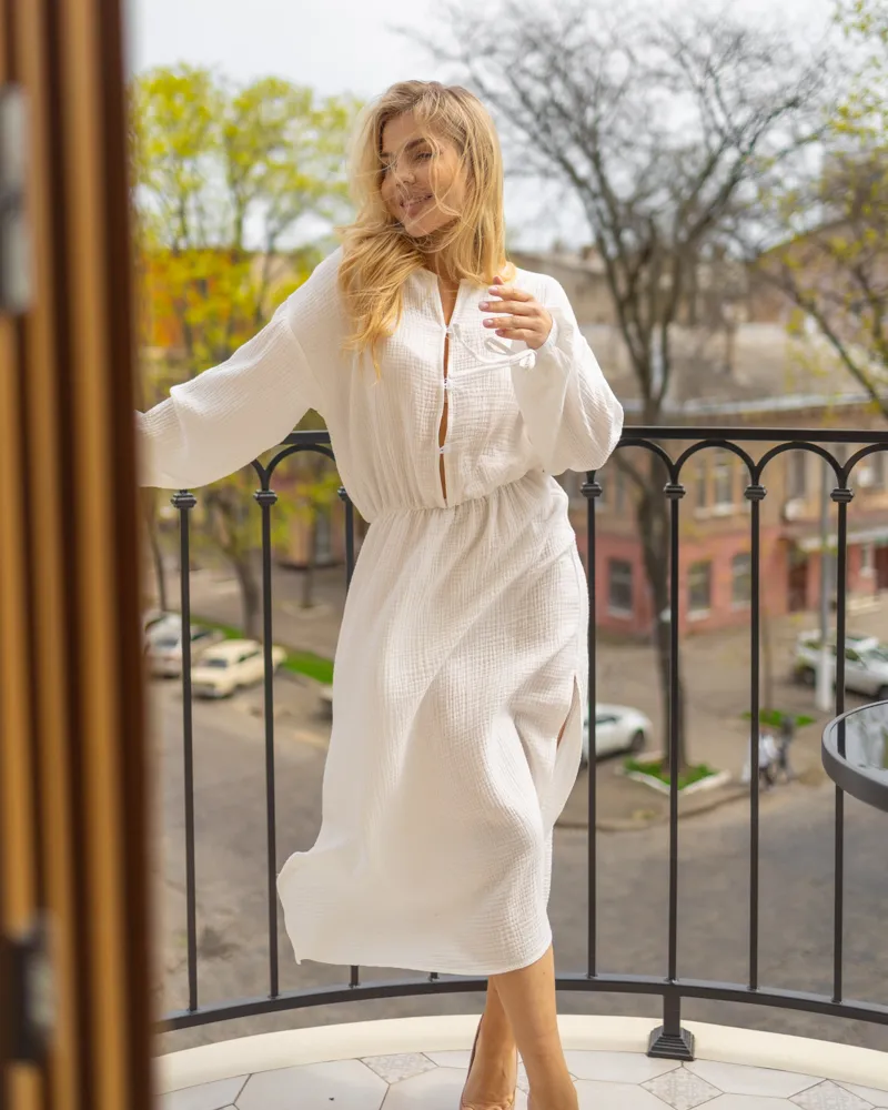 Повітряна сукня-міді із тканини муслін, яка така легка та невідчутна на тілі. Чудово пропускає повітря та дуже приємна на дотик.Модель зі спущеними рукавами-ліхтариками на манжетах із зав'язками, верх оздоблений ґудзиками. Резинка на талії підкреслить Вашу фігуру, а розрізи з обох боків зроблять образ ніжним та жіночним.