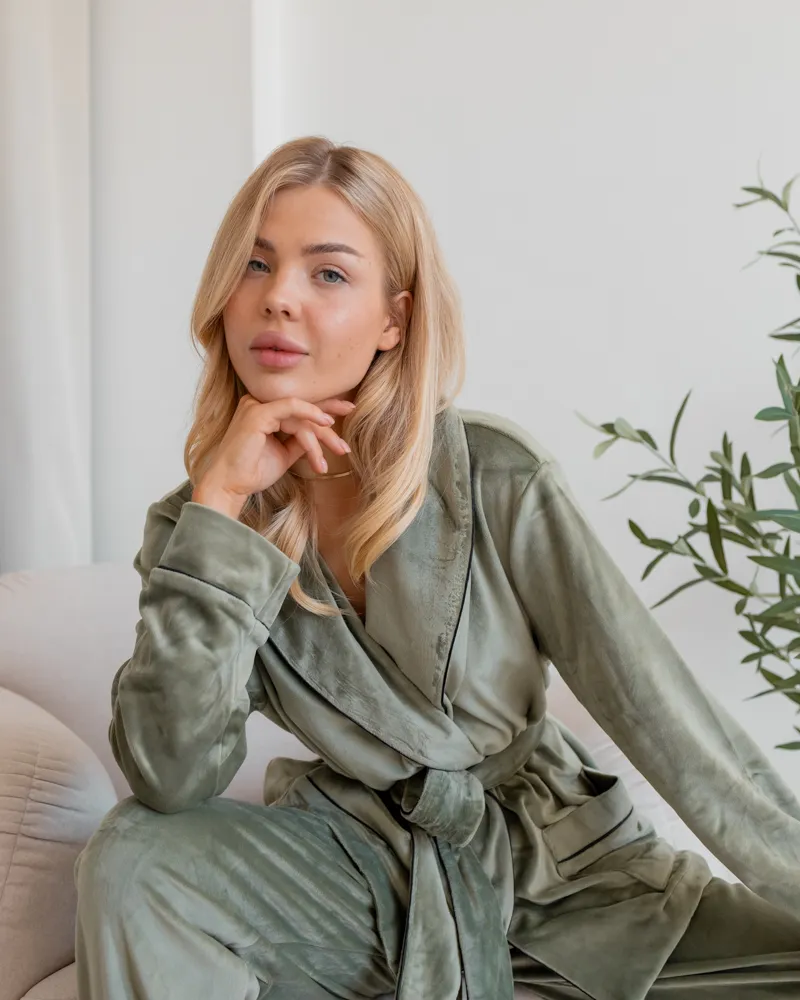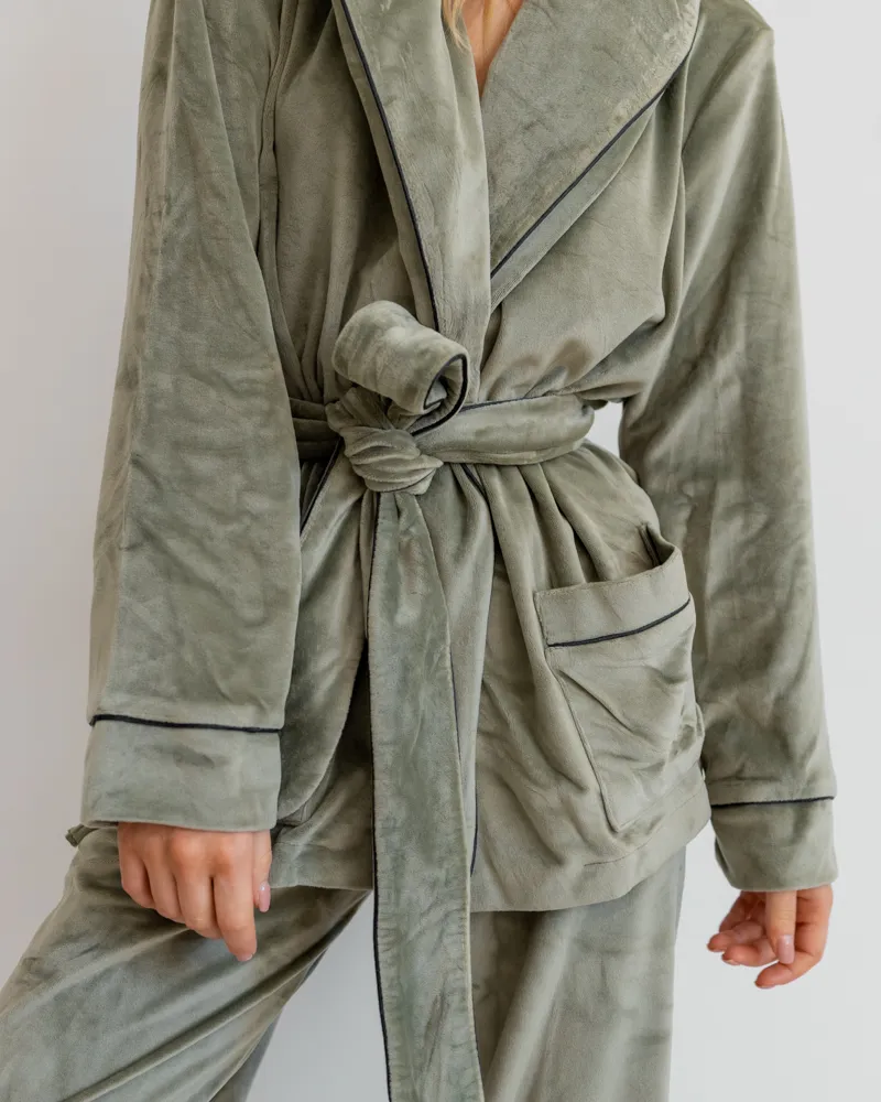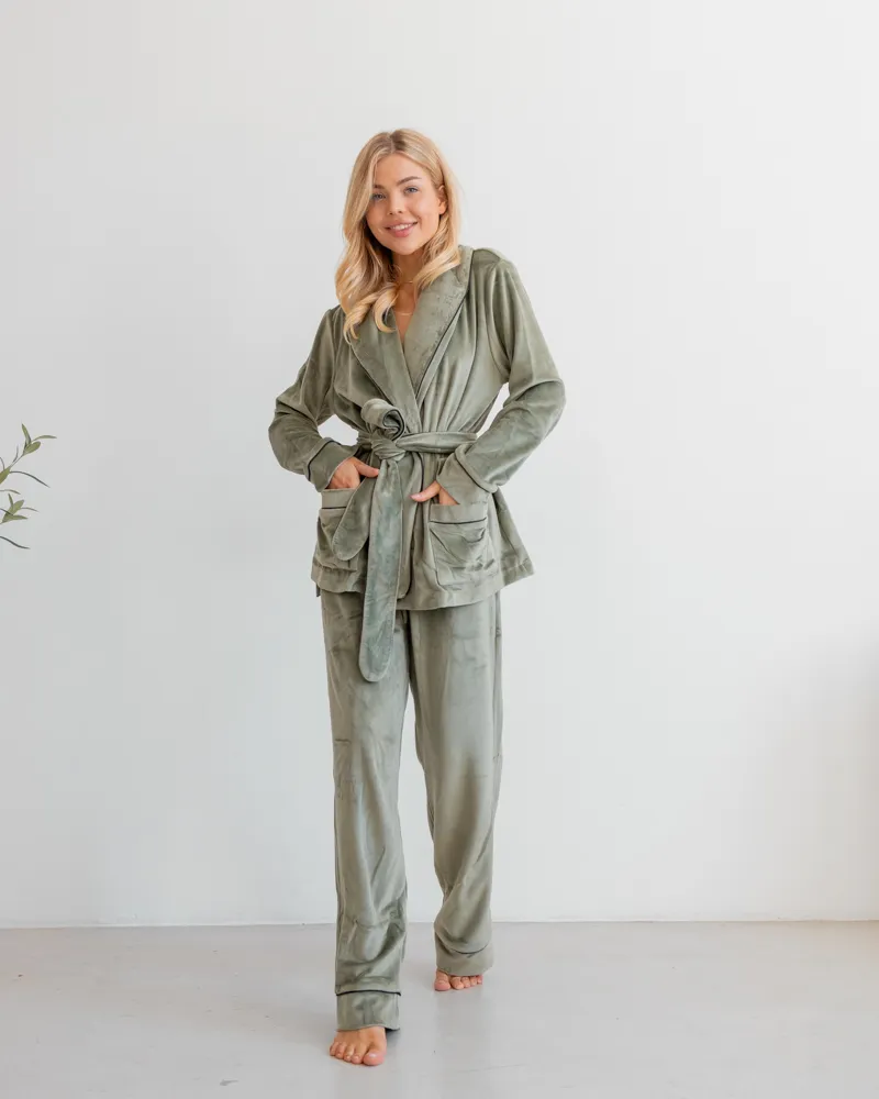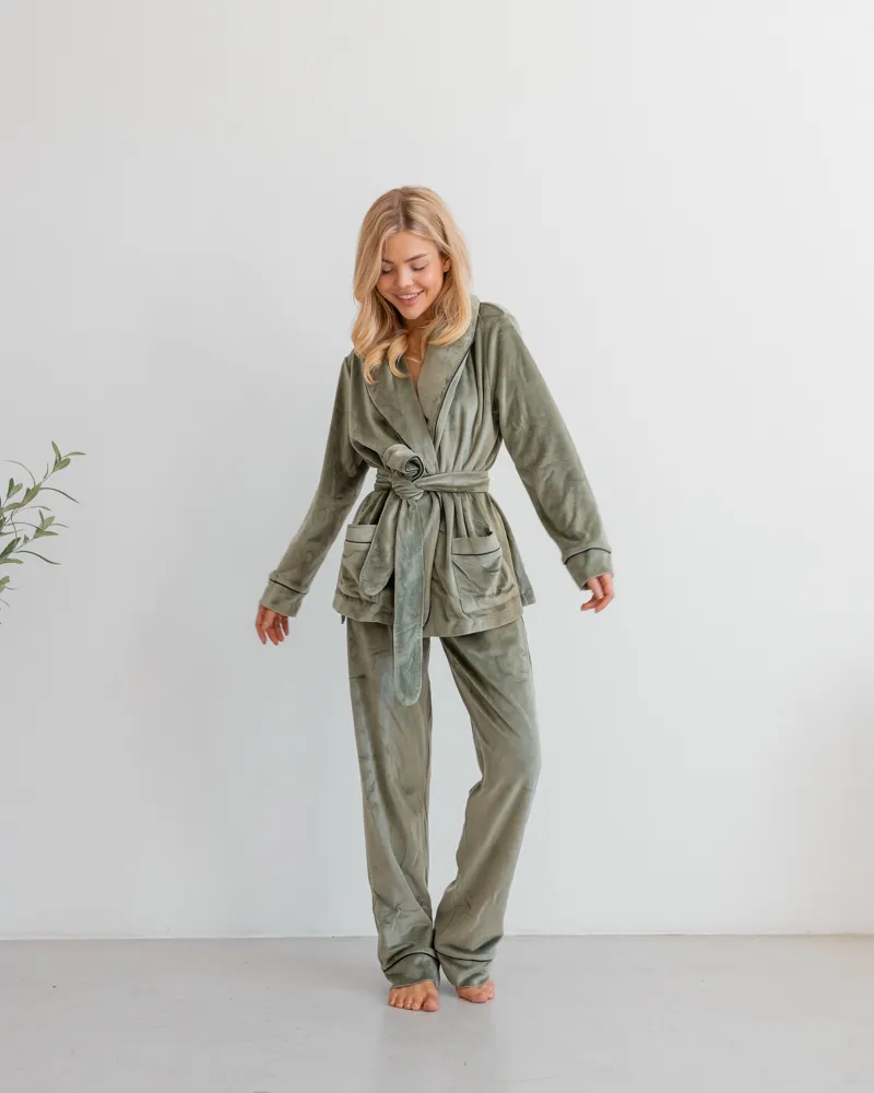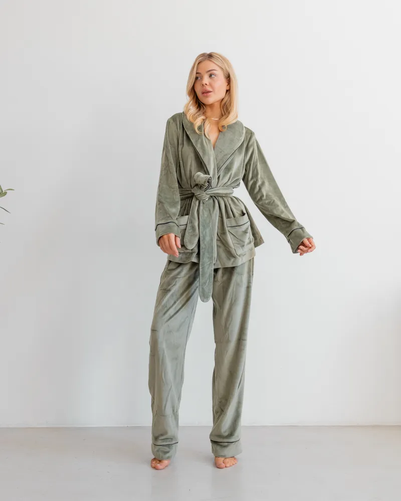 Головна / Каталог / Жінкам / Жіноча піжама / Піжама велюр Eva на запах Фісташковий