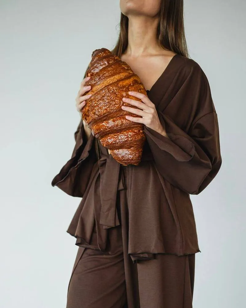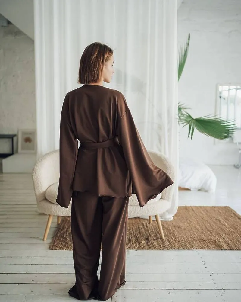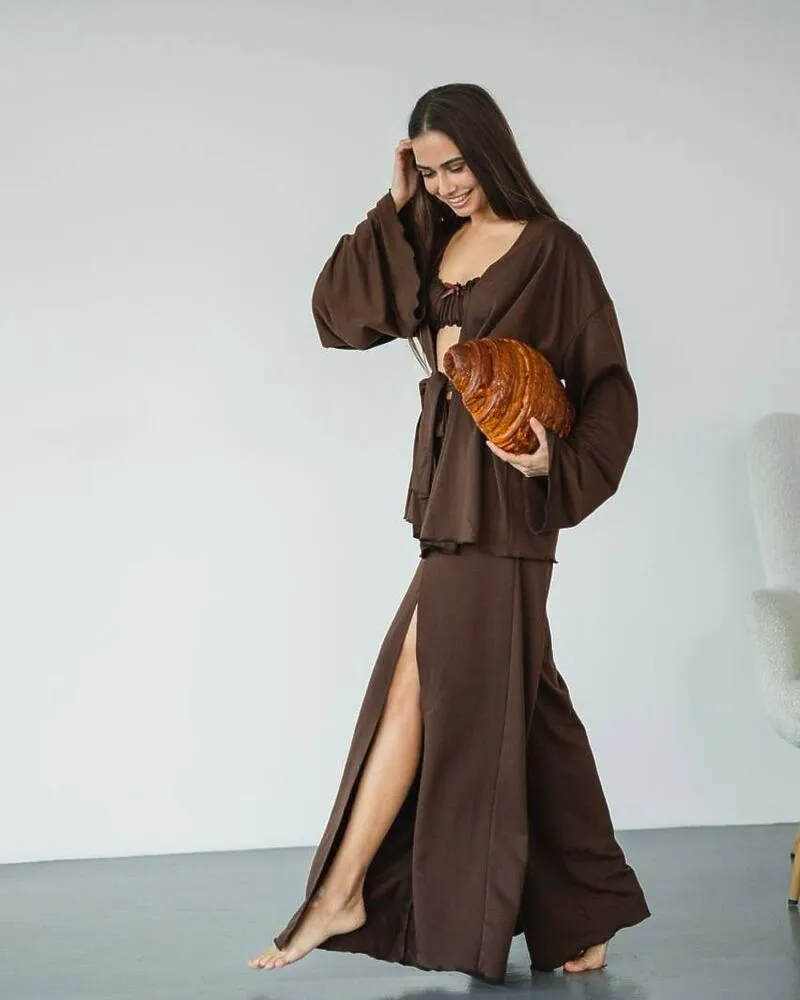 Домашній костюм "Afina" (халат+топ+штани) трикотаж двунитка Коричневий