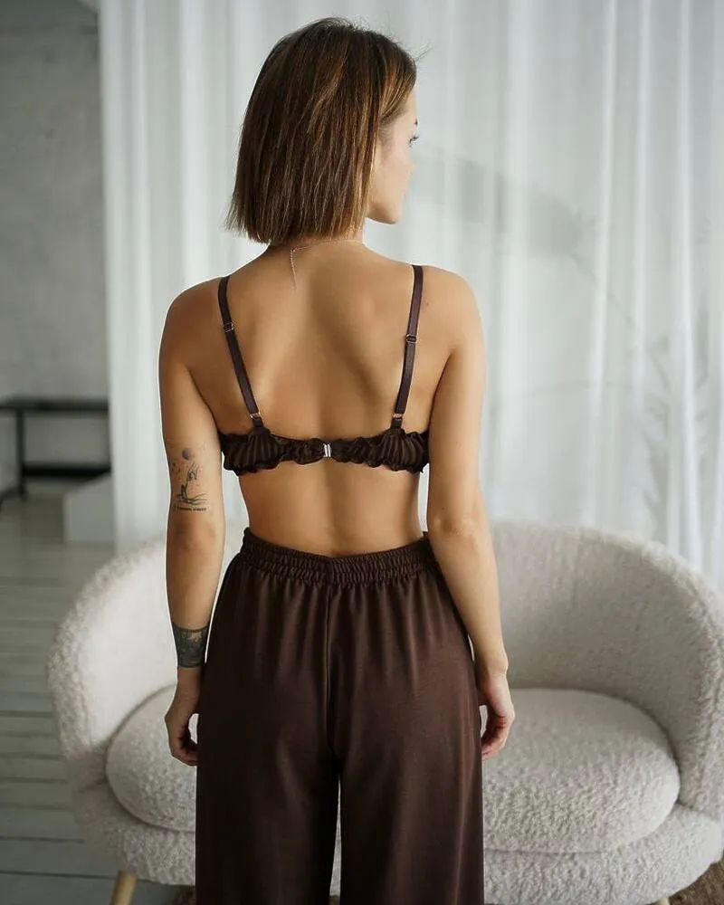 Комплект: халат із широкими рукавами, зручний ліф без чашочок з резинчастою основою на застібці та вільного крою довгі штани із розрізами спереду.
