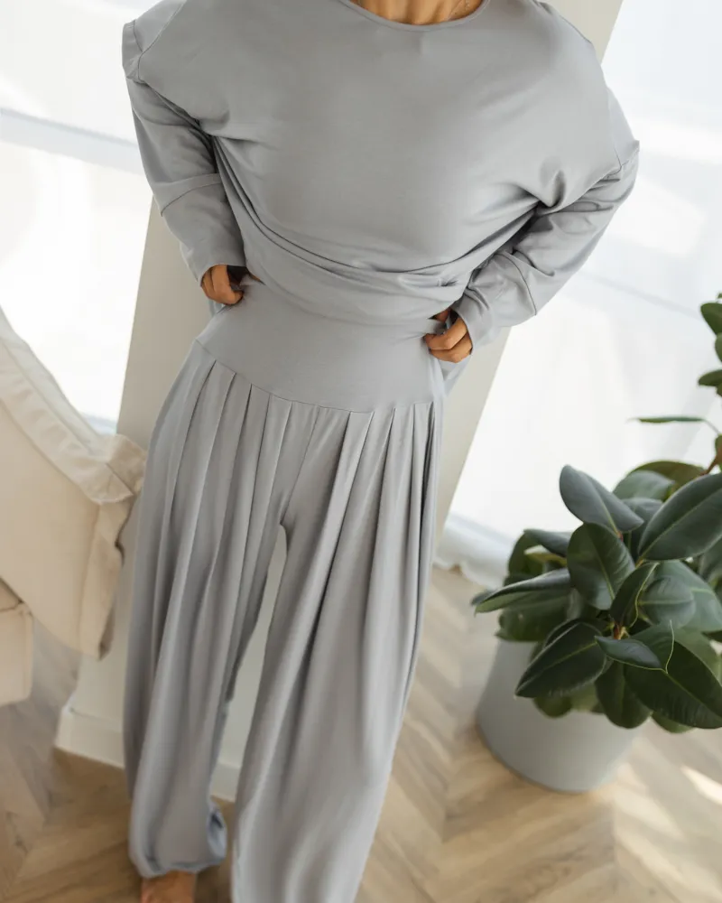 Комплект: вільного крою кофта зі спущеними рукавами з зав'язкою на спині та штани-аладіни зі збірками спереду, широкою резинкою на талії.