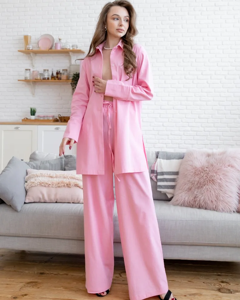 Комплект: довга сорочка на ґудзиках із манжетами та штани вільного крою - кльош на резинці із зав'язкою.