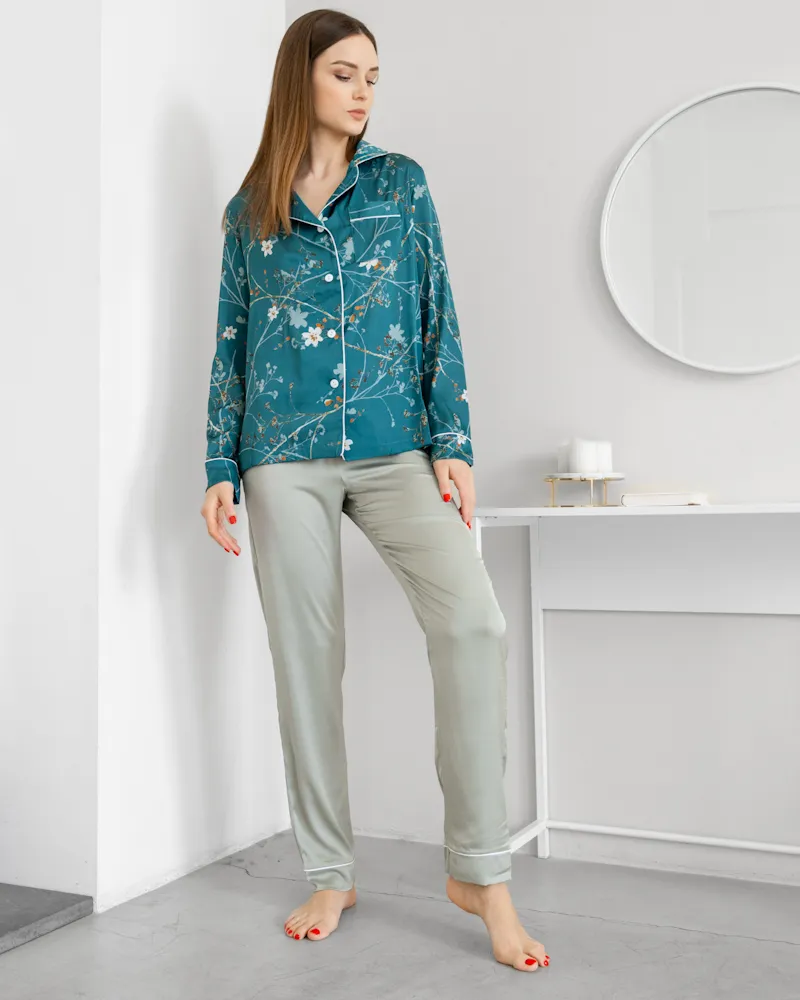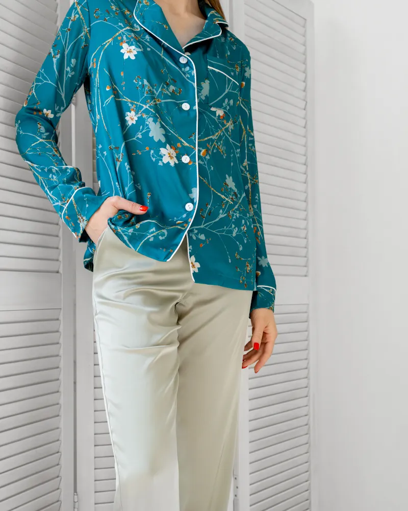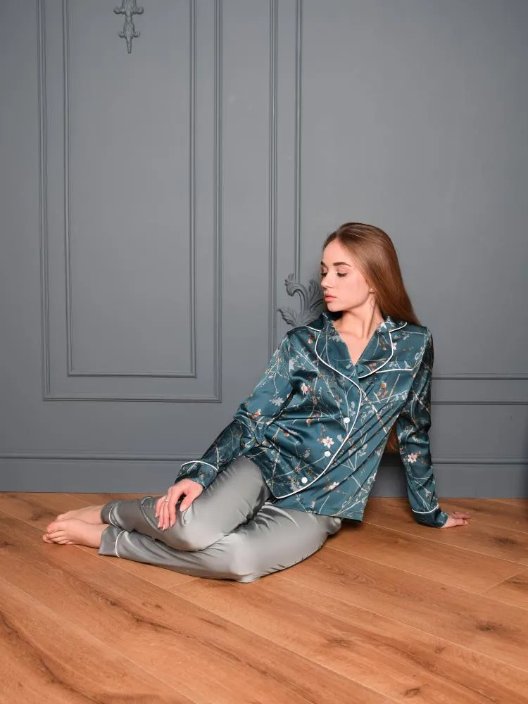 Зручний домашній костюм із тканини шовк Армані з квітковим візерунком, яка легка та приємна на дотик.