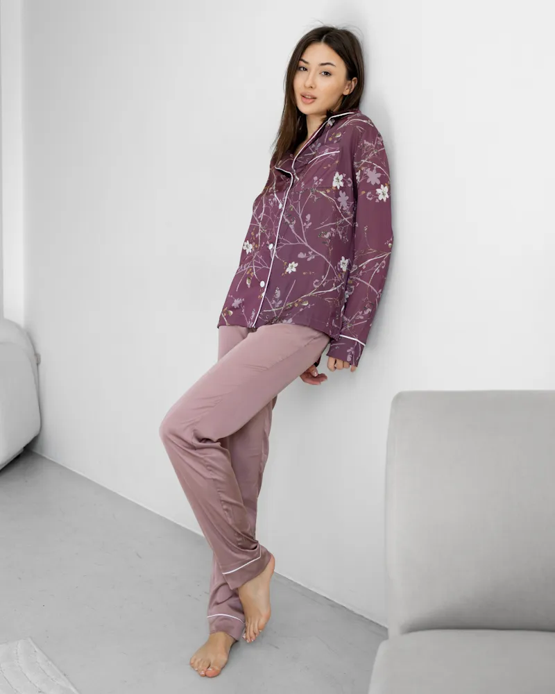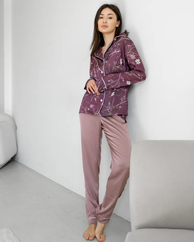 Зручний домашній костюм із тканини шовк Армані з квітковим візерунком, яка легка та приємна на дотик.