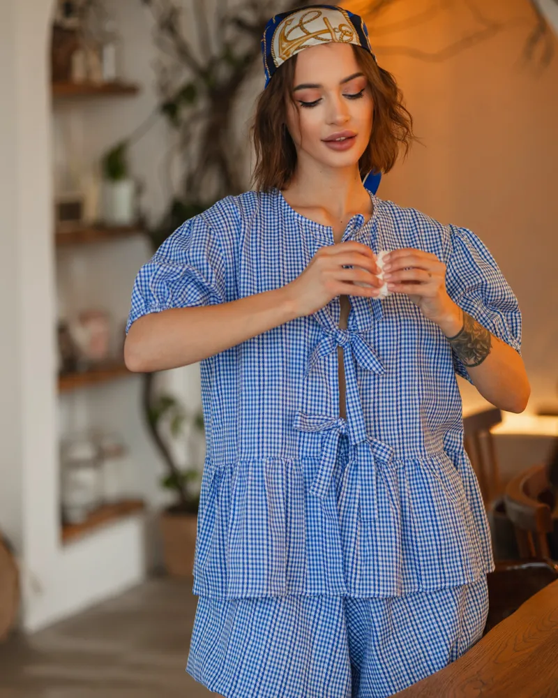 Комплект: сорочка на зав'язках з баскою, з короткими рукавами-ліхтариками та вільні шорти на резинці.