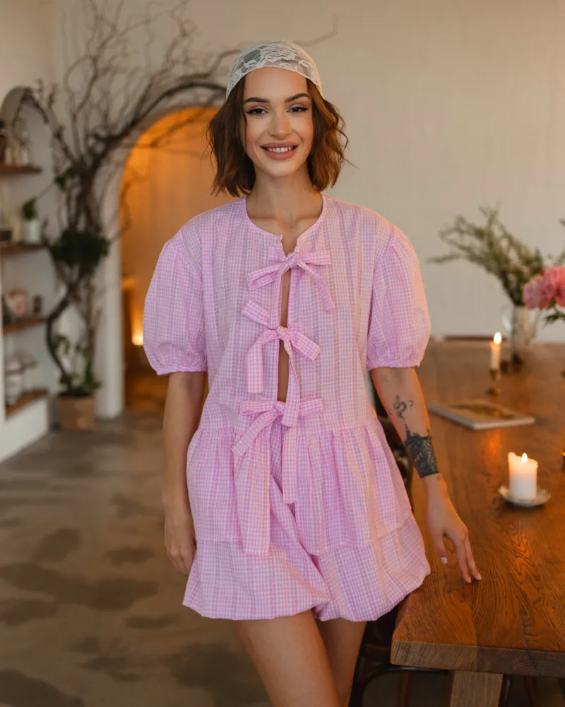 Комплект: сорочка на зав'язках з баскою, з короткими рукавами-ліхтариками та вільні шорти на резинці.