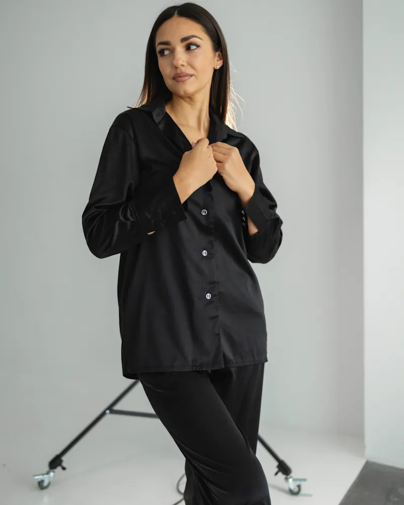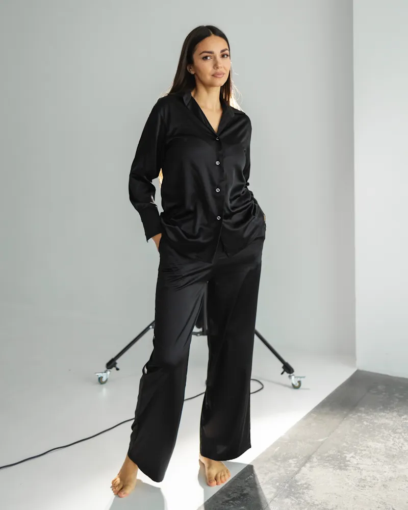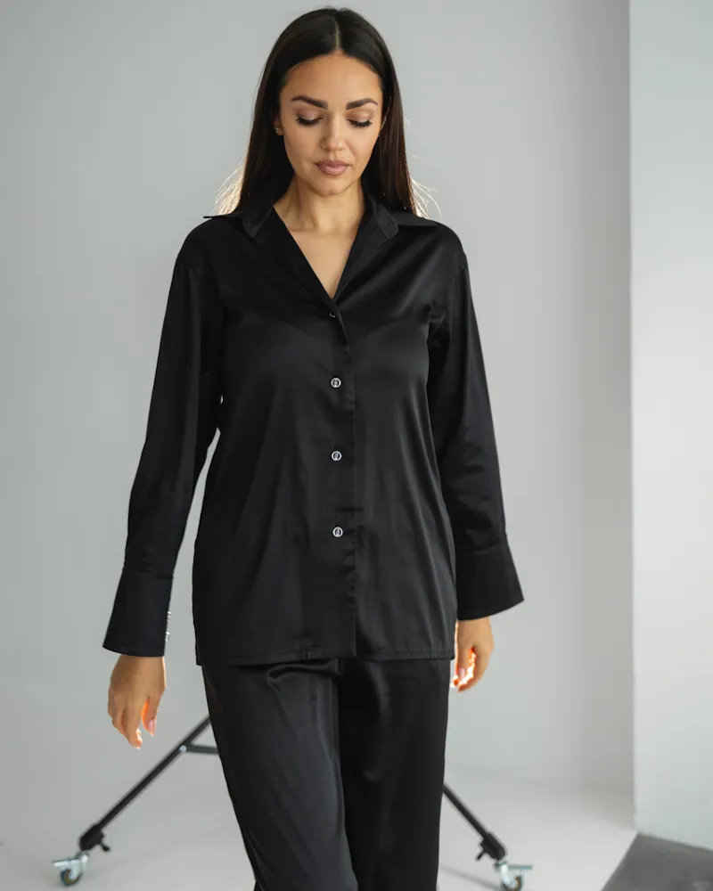 Повітряна сорочка на ґудзиках з високим манжетом та коміром, вільні штани на резинці зі шнурком.