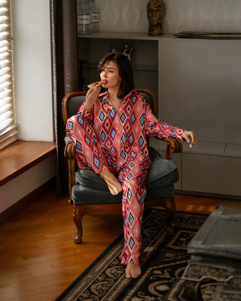 Домашній комплект: легка сорочка з манжетами та коміром на ґудзиках + штани вільного крою на резинці зі шнурівкою.