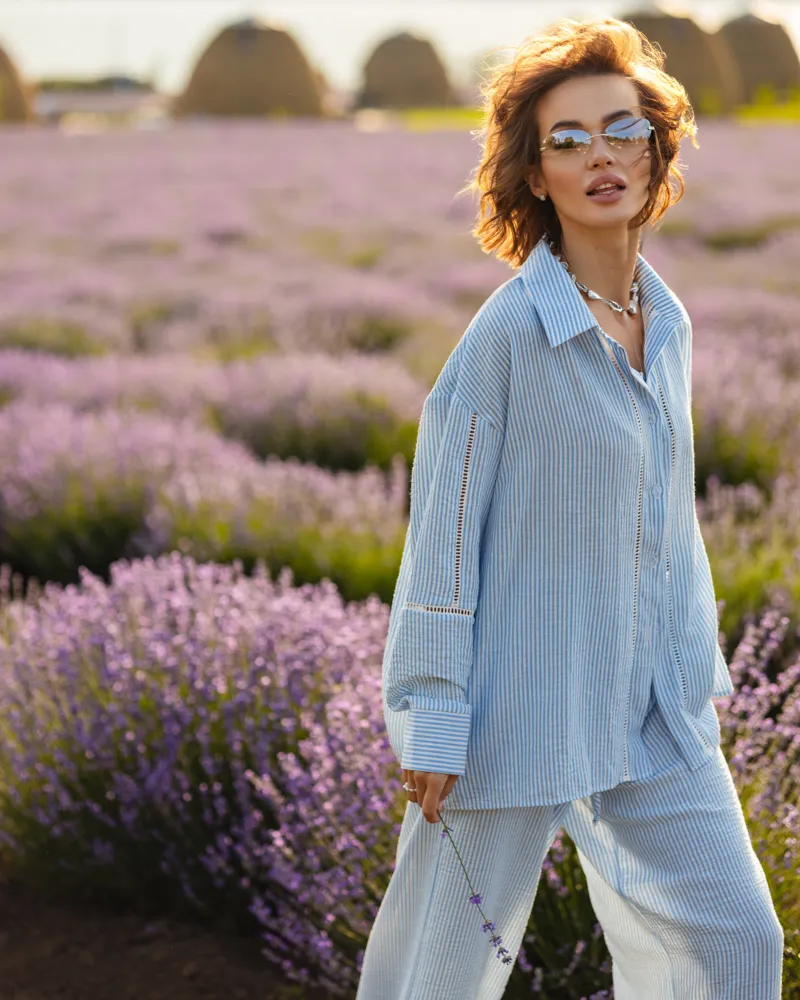 Комплект: довга сорочка на гудзиках, вільного крою штани-палаццо на резинці зі шнурком та кишенями, короткі шорти на зав'язці.