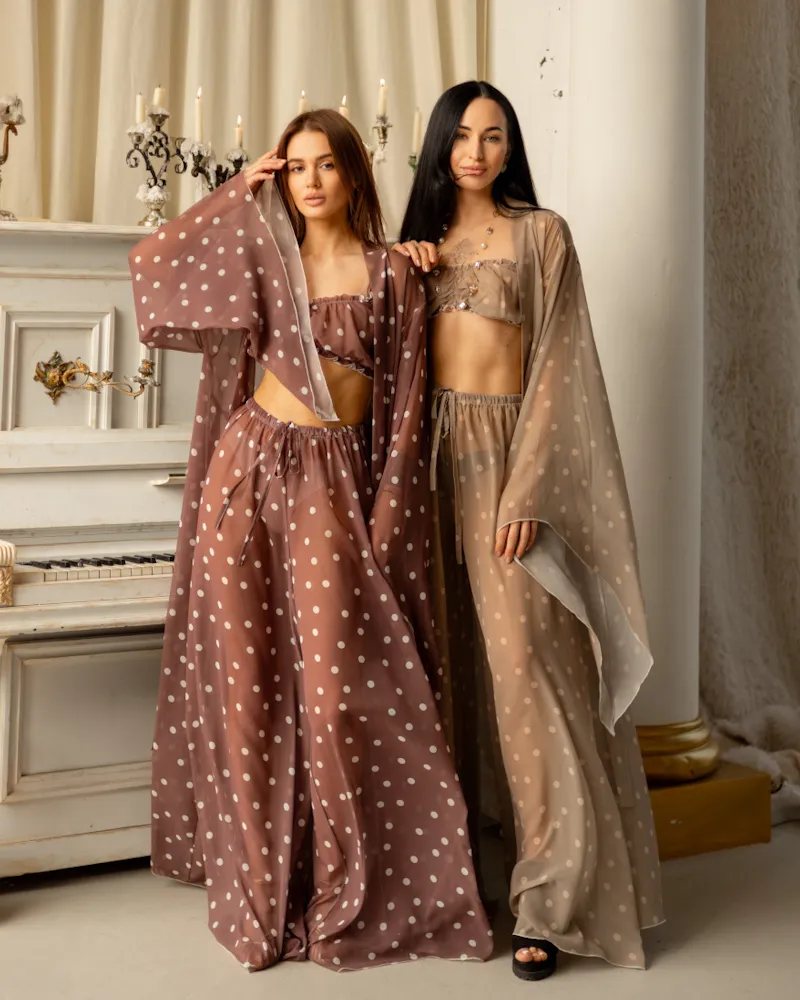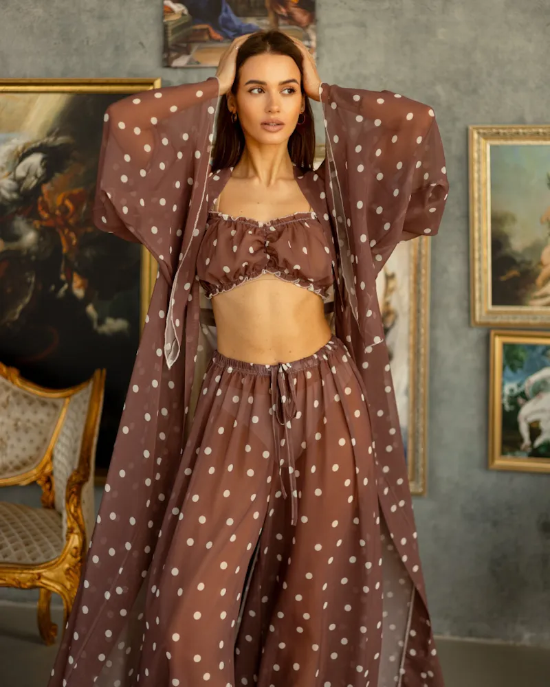 Елегантний комплект-трійка у трендовий горох: топ, штани та легка накидка.