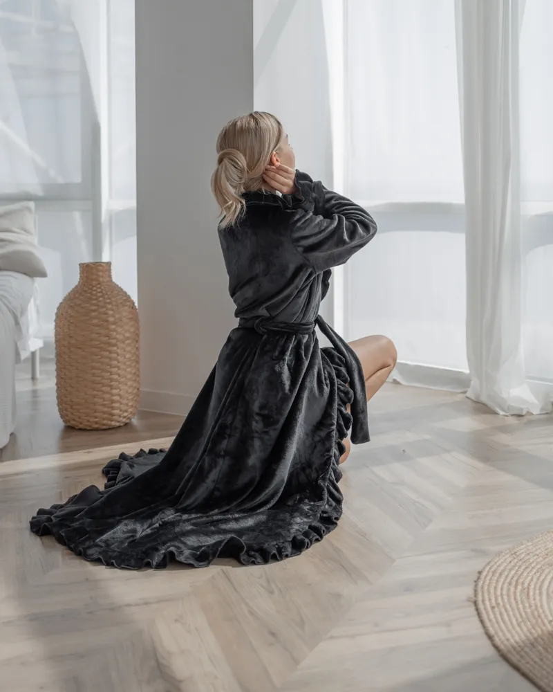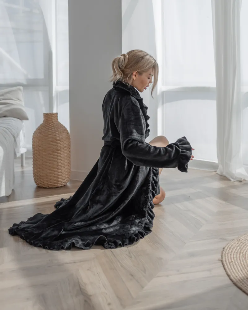 Халат просто незамінний для дому, якщо ви хочете відчувати комфорт. Він прекрашений рюшами на рукавах та по краю всього виробу.