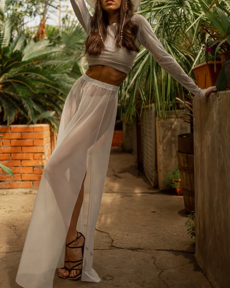 Стильний костюм-сітка: короткий топ із довгими рукавами та подовжена вільного крою спідниця із розрізом на ніжці.