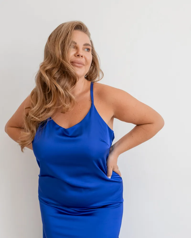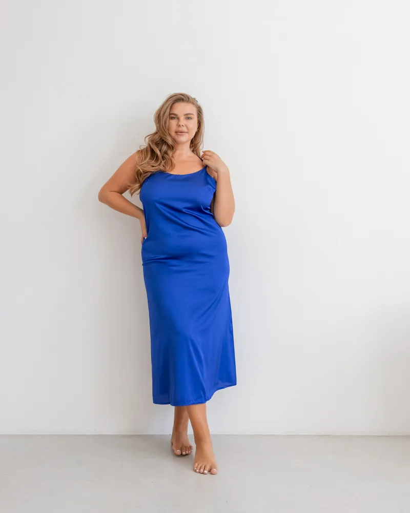 Модель представлена в довжині міді з відкритою спиною, бретелі регулюються.
