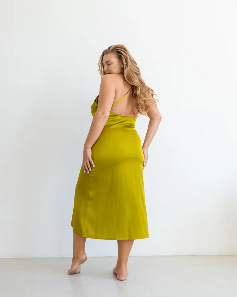 Модель представлена в довжині міді з відкритою спиною, бретелі регулюються.