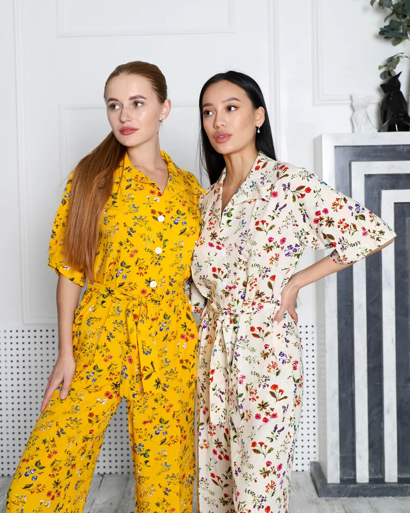 Рукав 3/4, короткі вільні штани, верх оздоблений ґудзиками і поясом на талії, що чудово пікреслює фігуру.