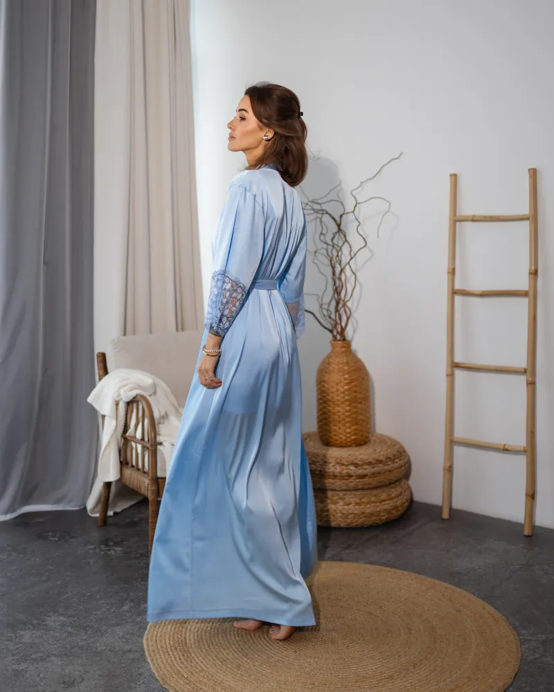 Піжамний костюм "Catalina" тканина шовк Армані преміум + мереживо (халат+нічна сорочка) Блакитний