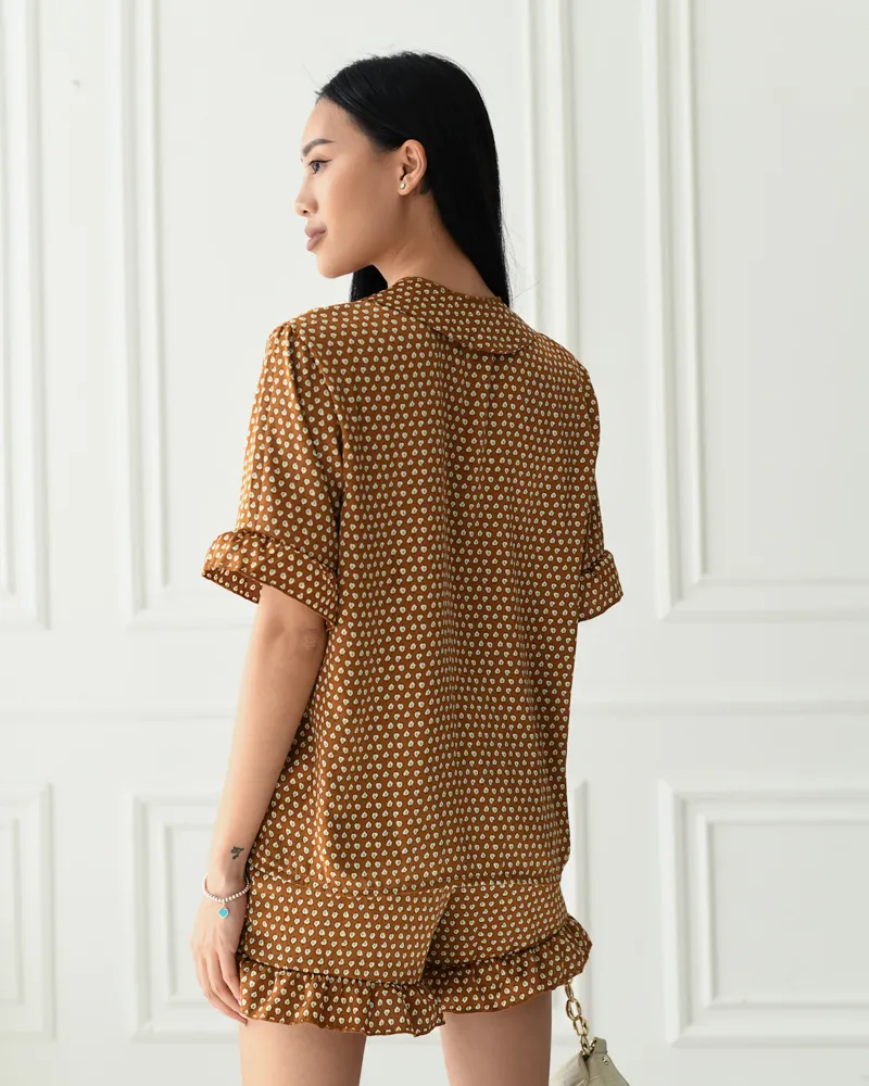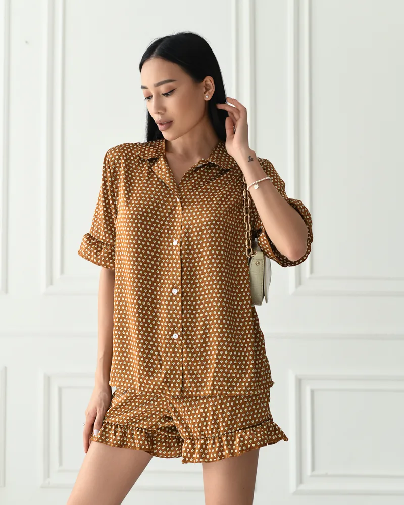 Комплект: сорочка на ґудзиках з коротким рукавом з воланами та вільні шорти з воланами на резинці.