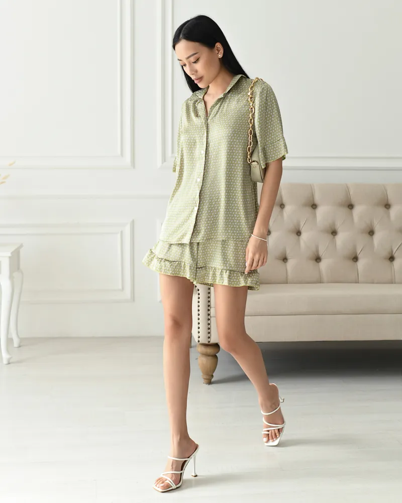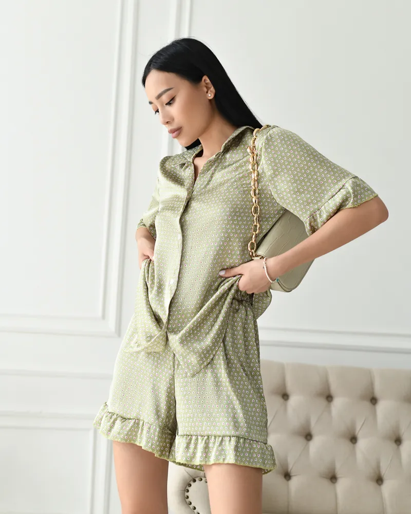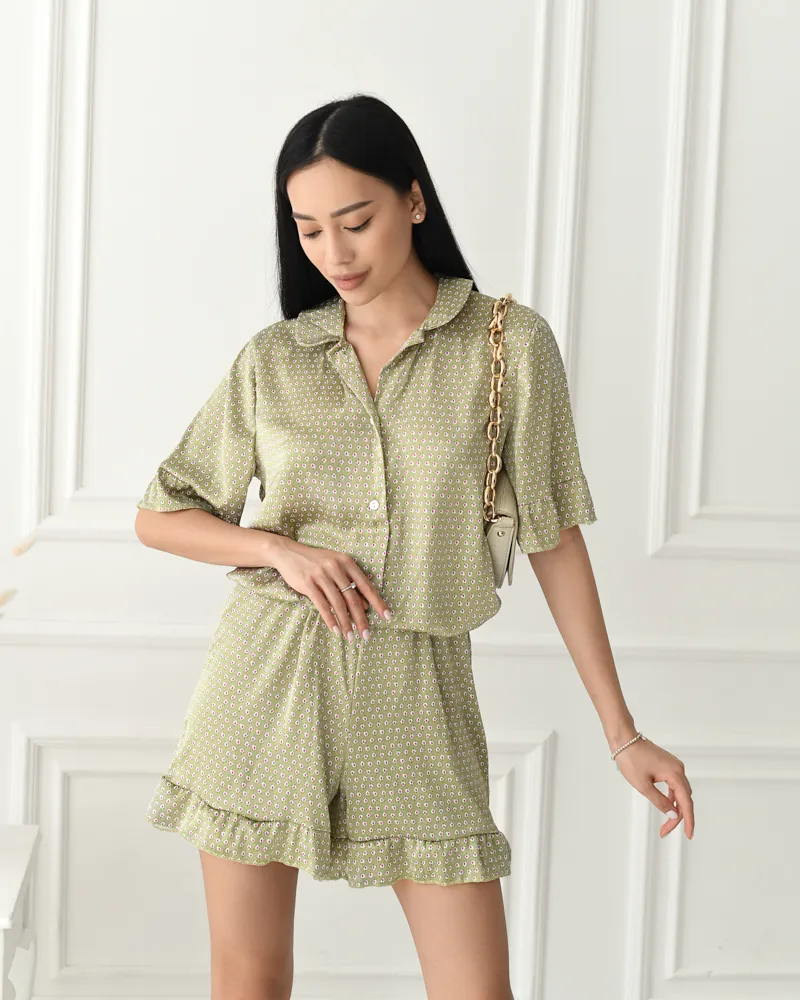 Комплект: сорочка на ґудзиках з коротким рукавом з воланами та вільні шорти з воланами на резинці.