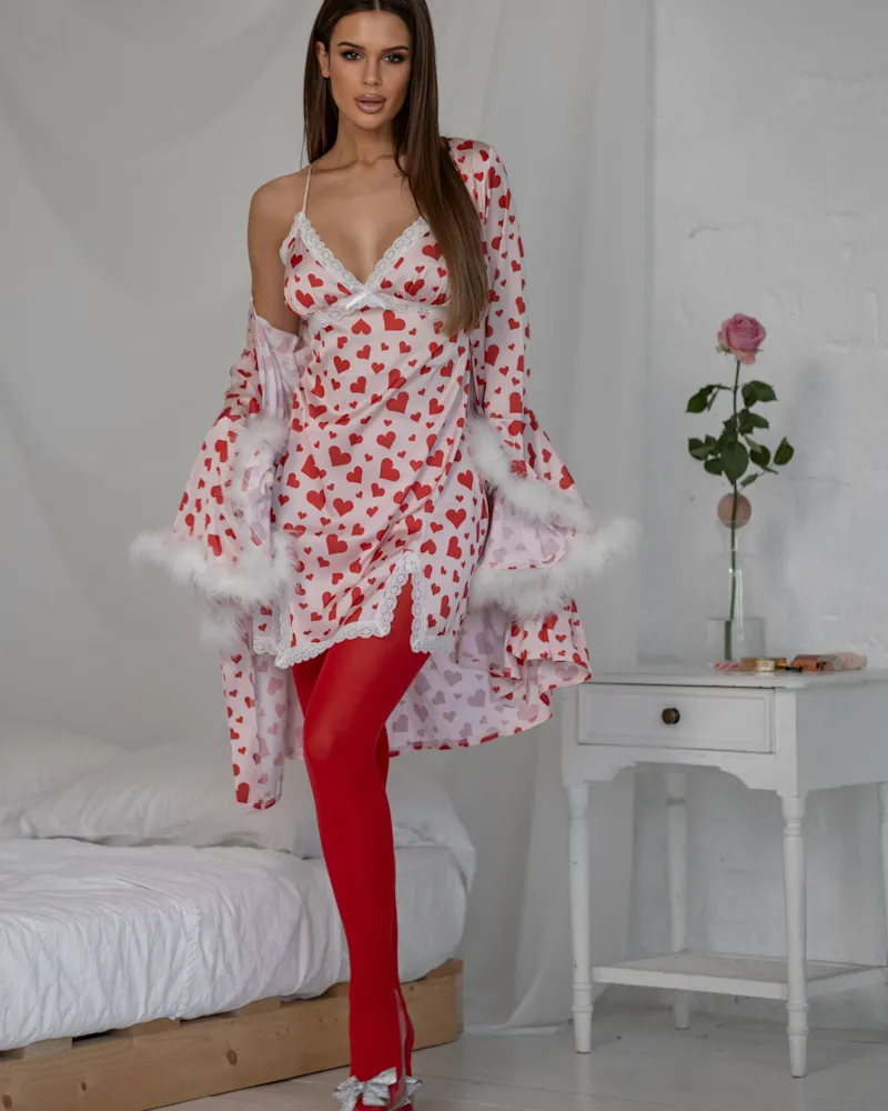 Піжамний костюм із принтом сердечки із шовку Армані з додаванням натурального пір'я.