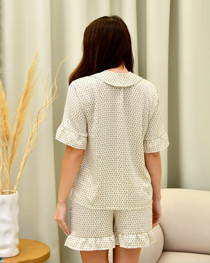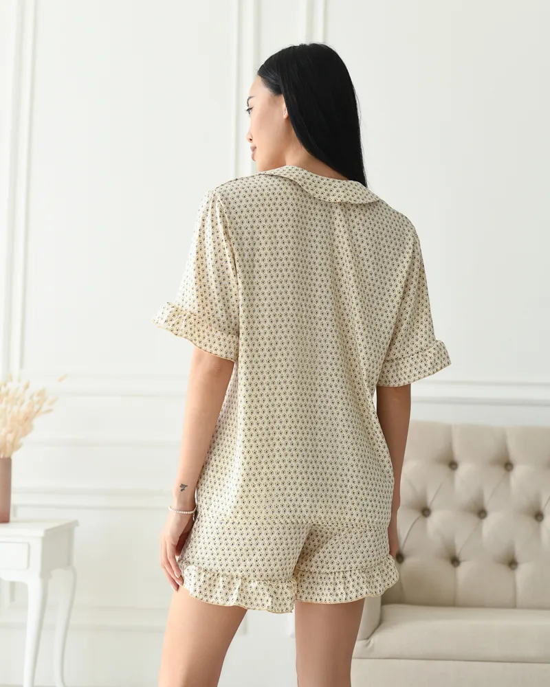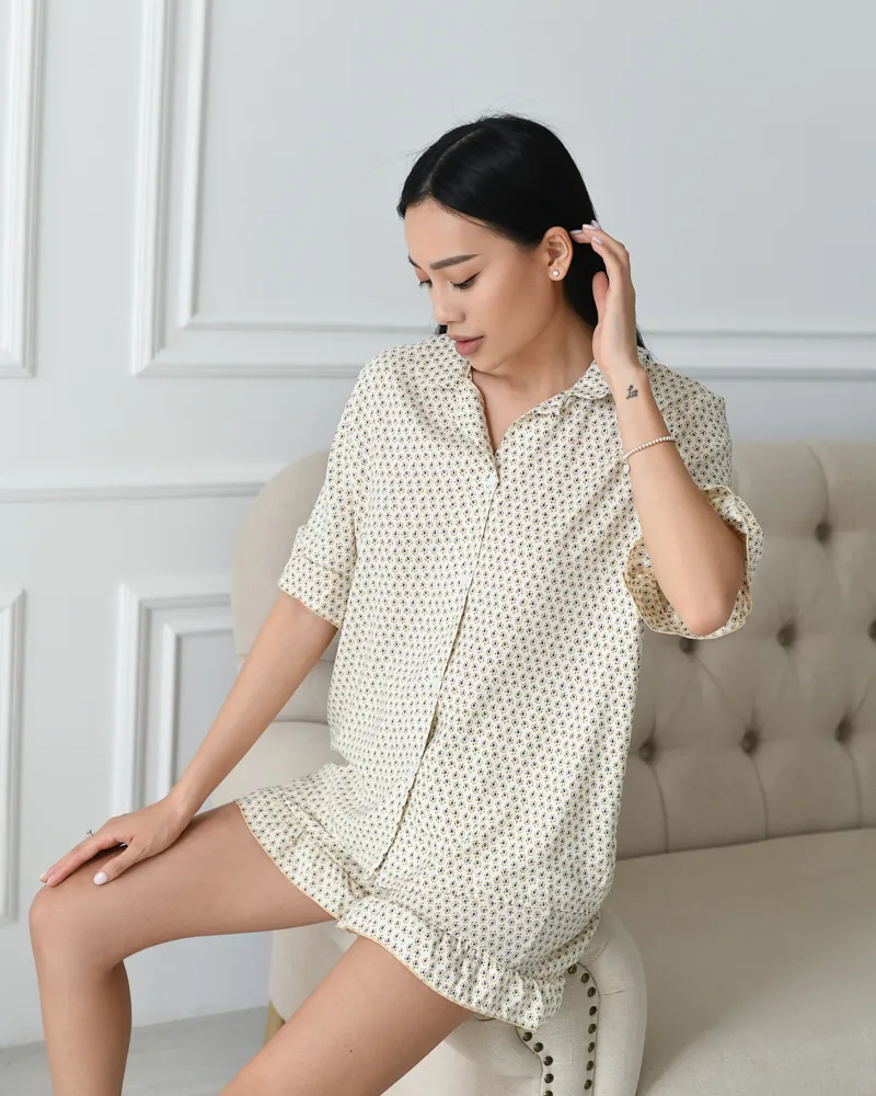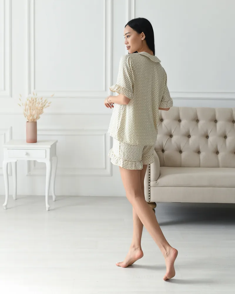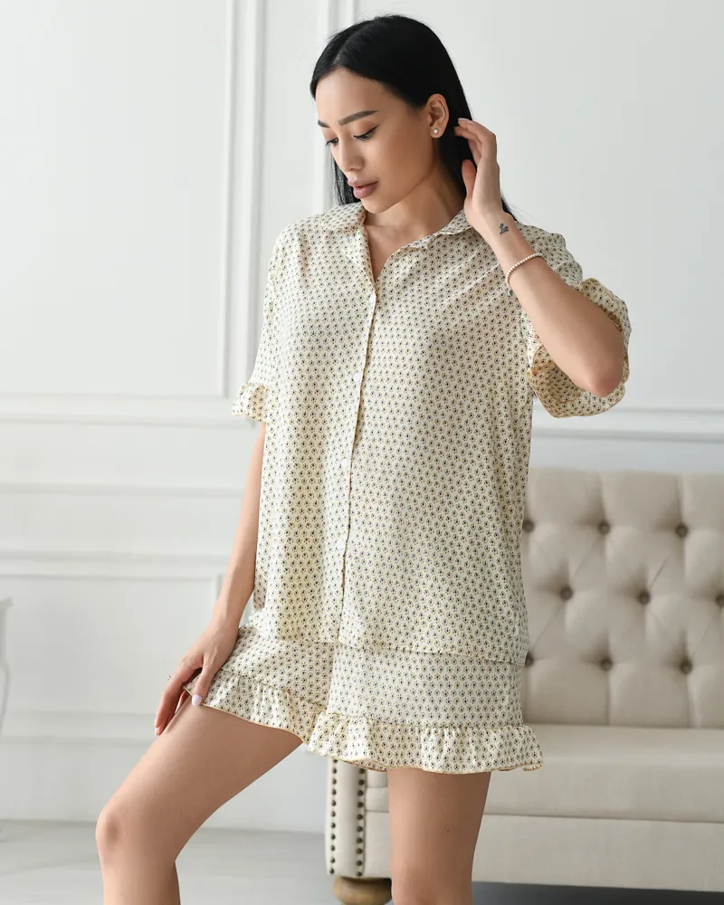 Комплект: сорочка на ґудзиках з коротким рукавом з воланами та вільні шорти з воланами на резинці.