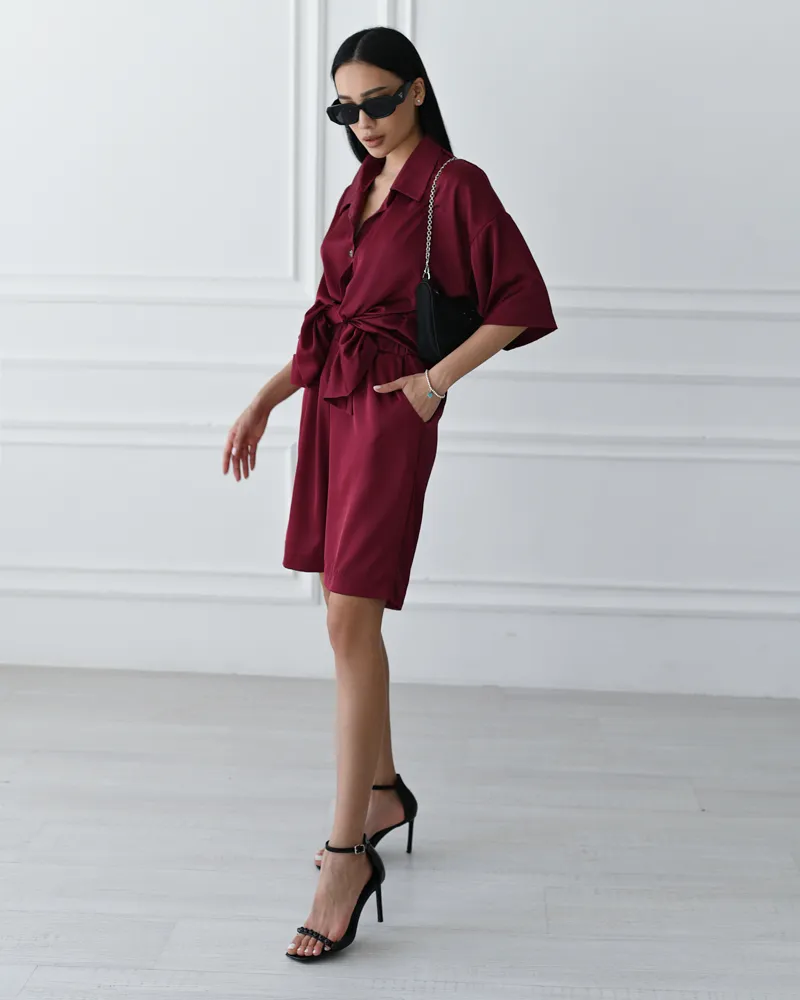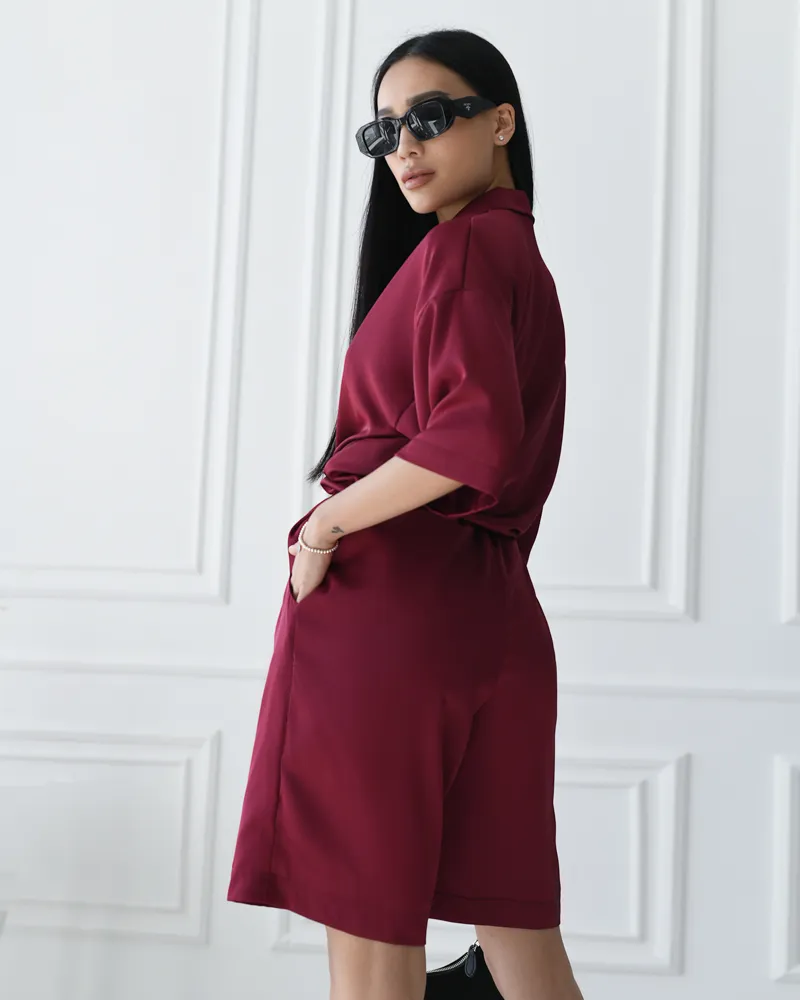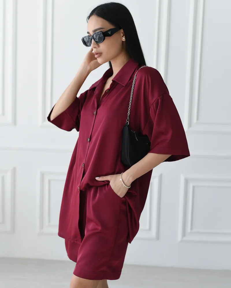 Комплект складається з легкої сорочки на ґудзиках із коротким рукавом та вільними подовженими шортами на резинці.
