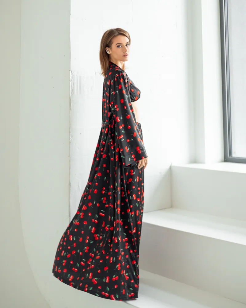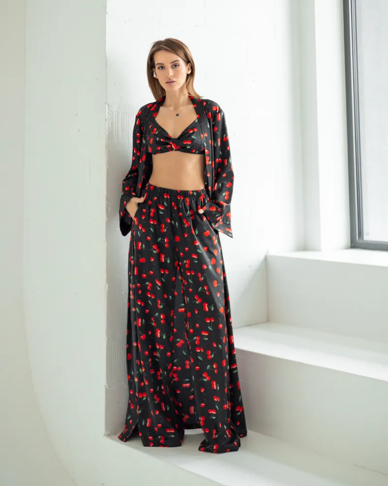 Піжамний костюм-трійка Helen італійський шовк (бра+халат+штани) Вишні на чорному