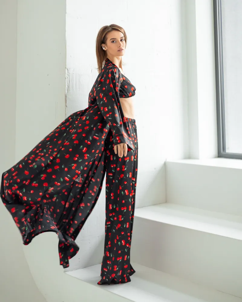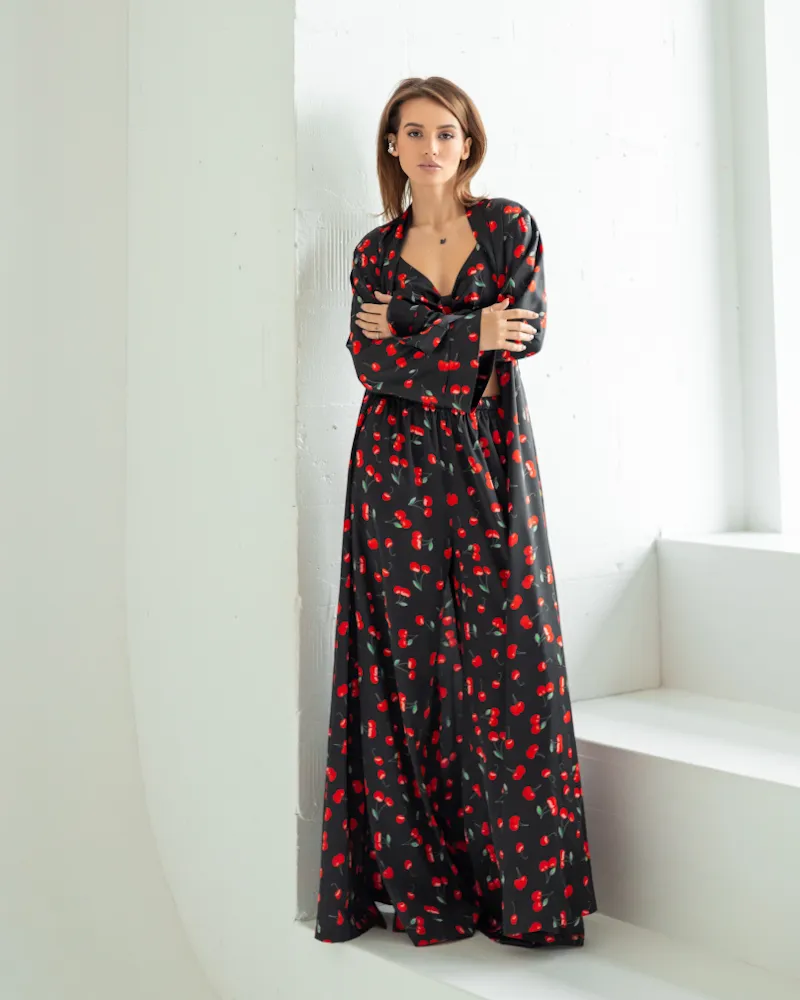 Головна / Каталог / Жінкам / Піжамний костюм / Піжамний костюм-трійка Helen італійський шовк (бра+халат+штани) Вишні на чорному