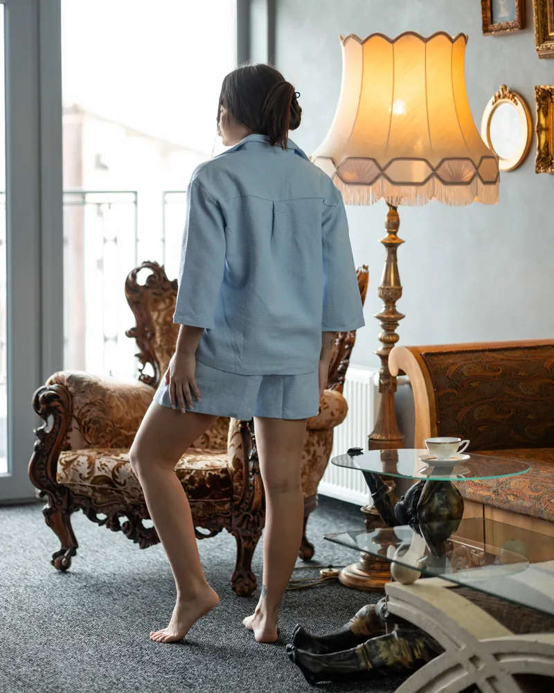 Комплект складається з вільної сорочки на ґудзиках та укорочених шортиків на резинці з кишенями.