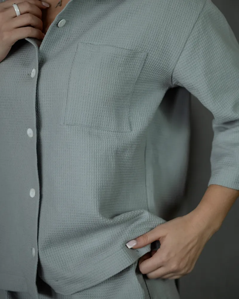Комплект складається з вільної сорочки на ґудзиках та укорочених шортиків на резинці з кишенями.