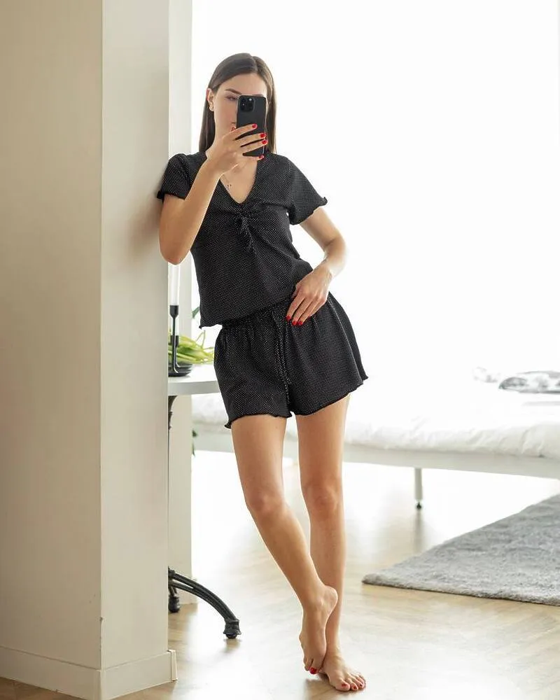Затишна піжама з віскози складається з футболки зі зборкою на грудях та вільних шортів на резинці.