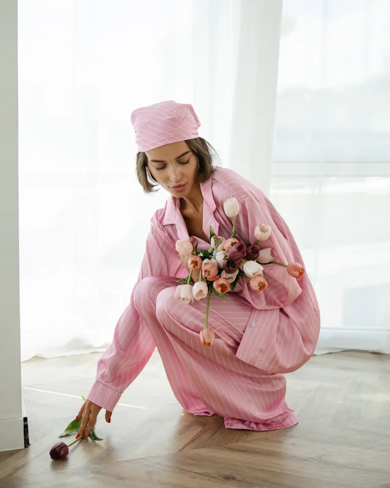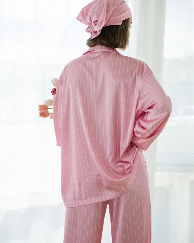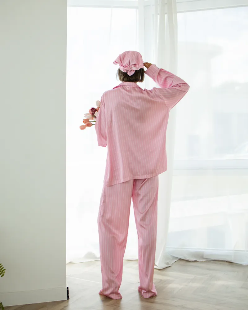 Головна / Каталог / Жінкам / Жіноча піжама / Піжама "Kleo" в смужку шовк Армані + хустинка Рожевий