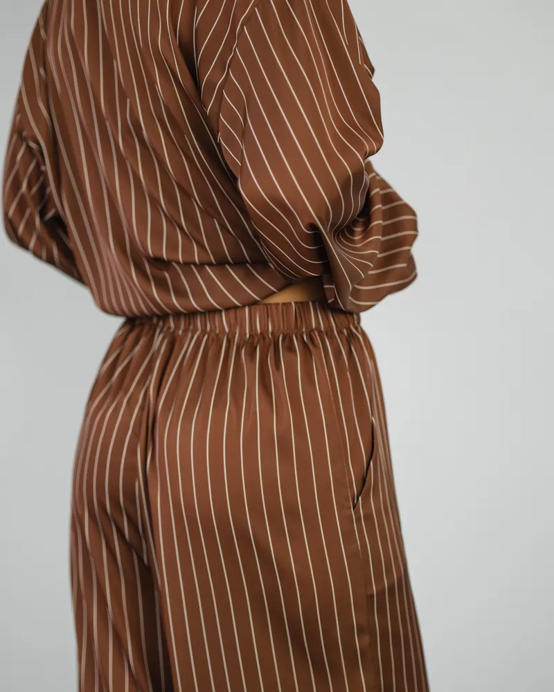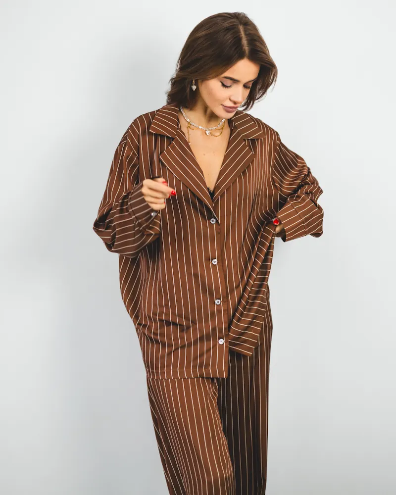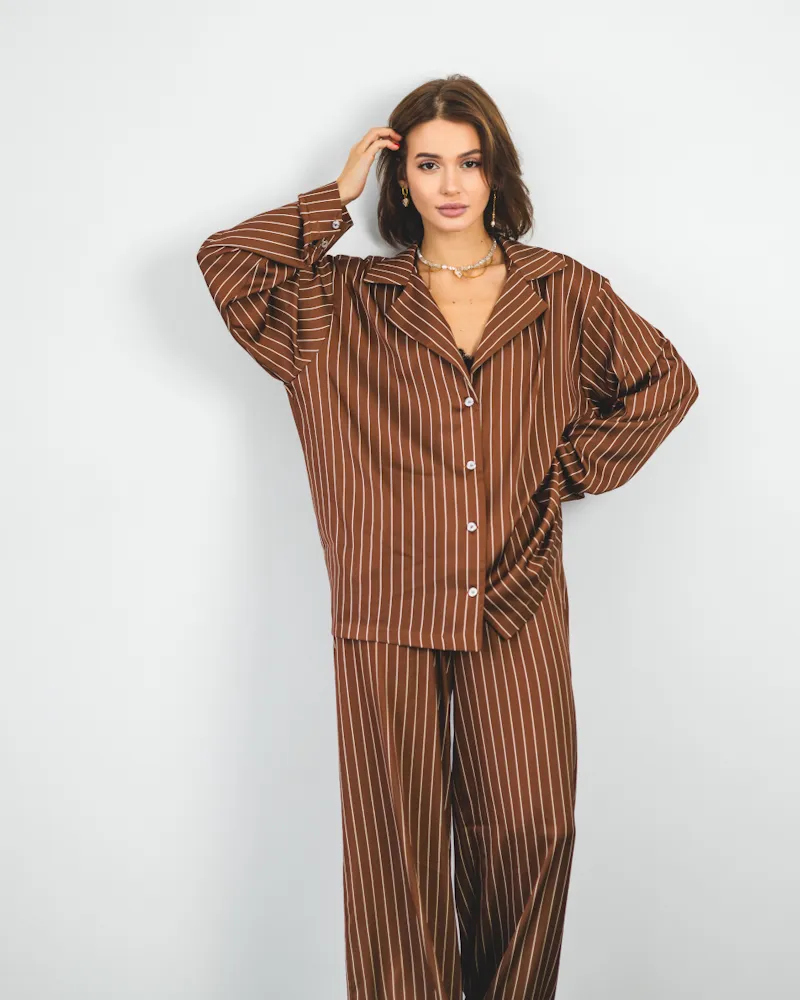 Головна / Каталог / Жінкам / Жіноча піжама / Піжама "Kleo" в смужку шовк Армані + хустинка Коричневий