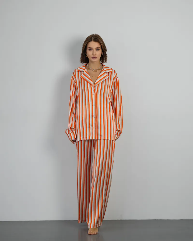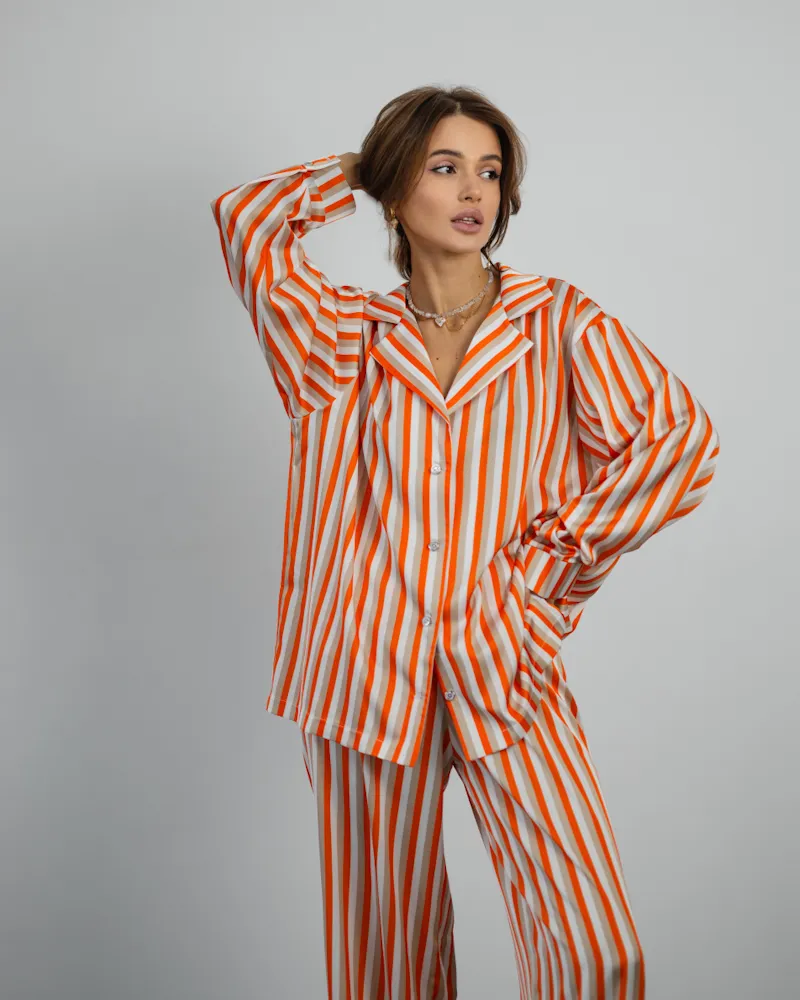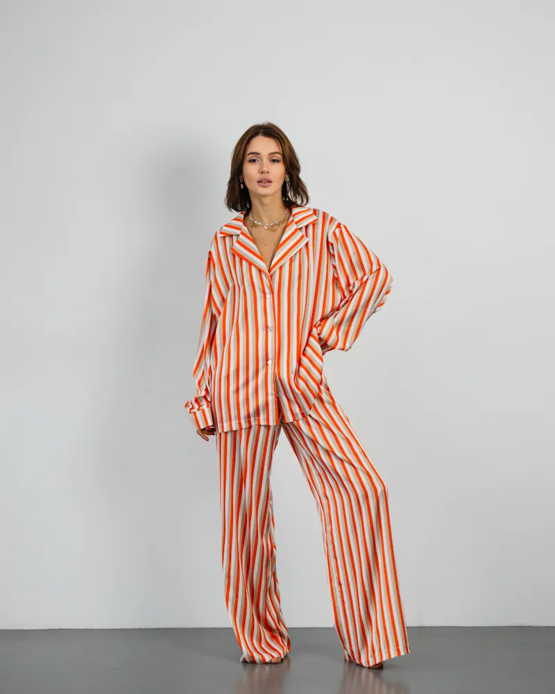 Головна / Каталог / Жінкам / Жіноча піжама / Піжама "Kleo" в смужку шовк Армані + хустинка Помаранчевий