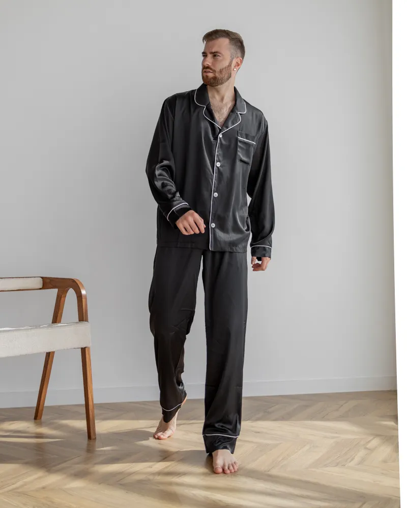 Чоловіча піжама з якісної тканини шовк Армані.Тканина м'яка та приємна до тіла, не електризується і не втрачає колір після прання.Модель комфортна, чудово підходить для сну.