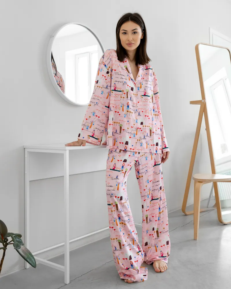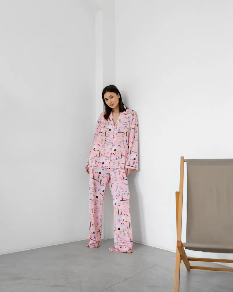 Піжама виконана в класичному стилі: сорочка на ґудзиках та штани прямого крою на резинці.