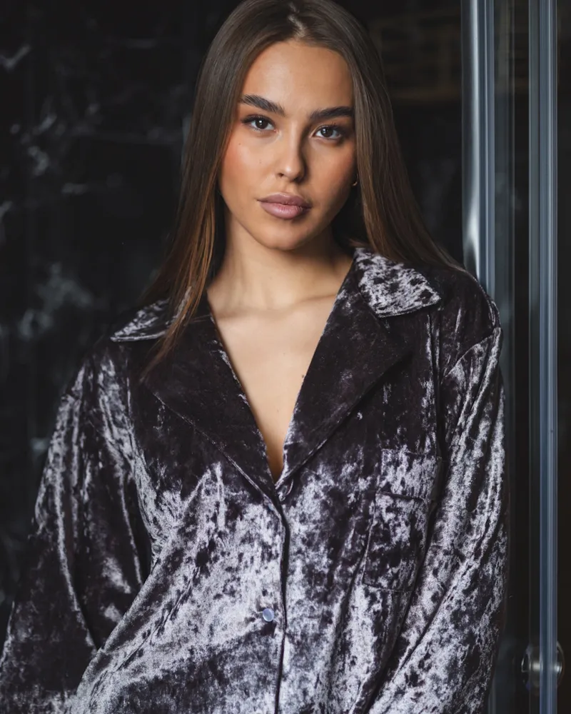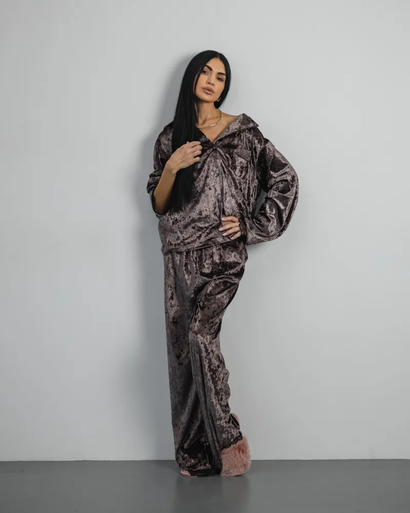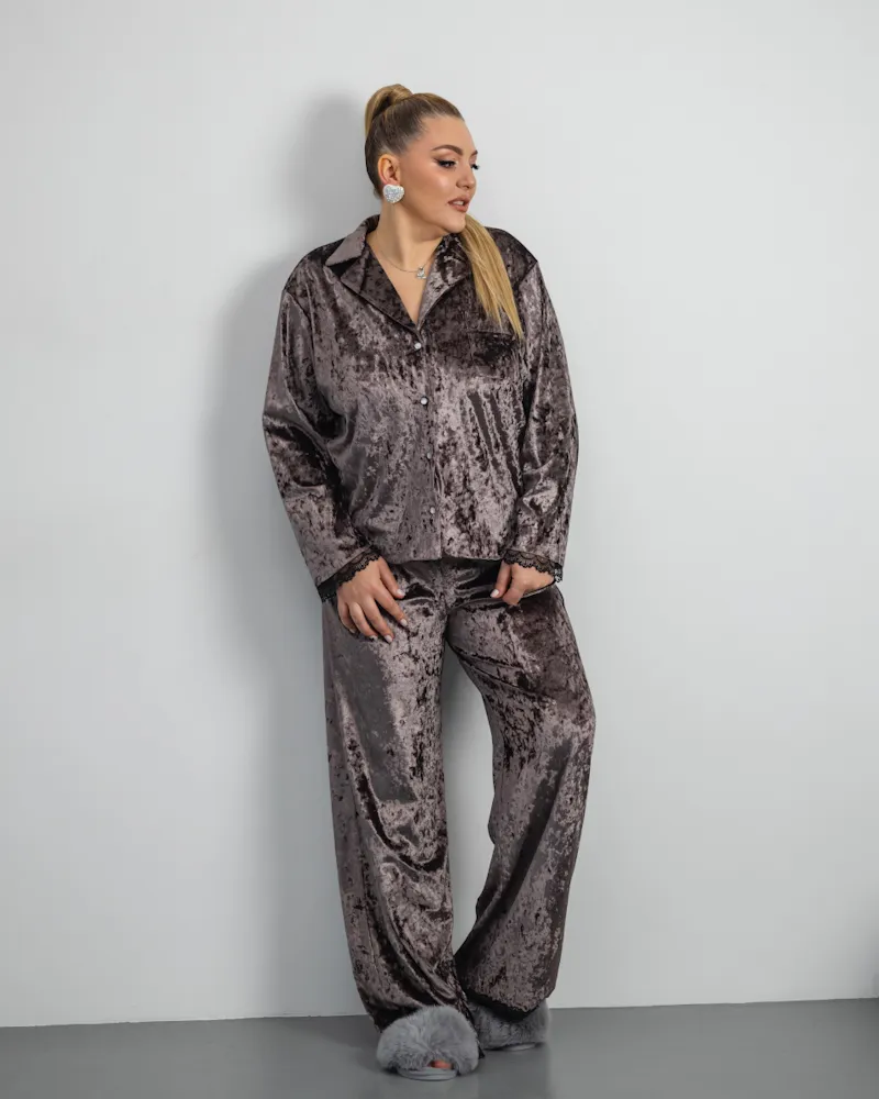 Головна / Каталог / Жінкам / Жіноча піжама / Піжама "Vella" мармуровий велюр + мереживо Коричневий