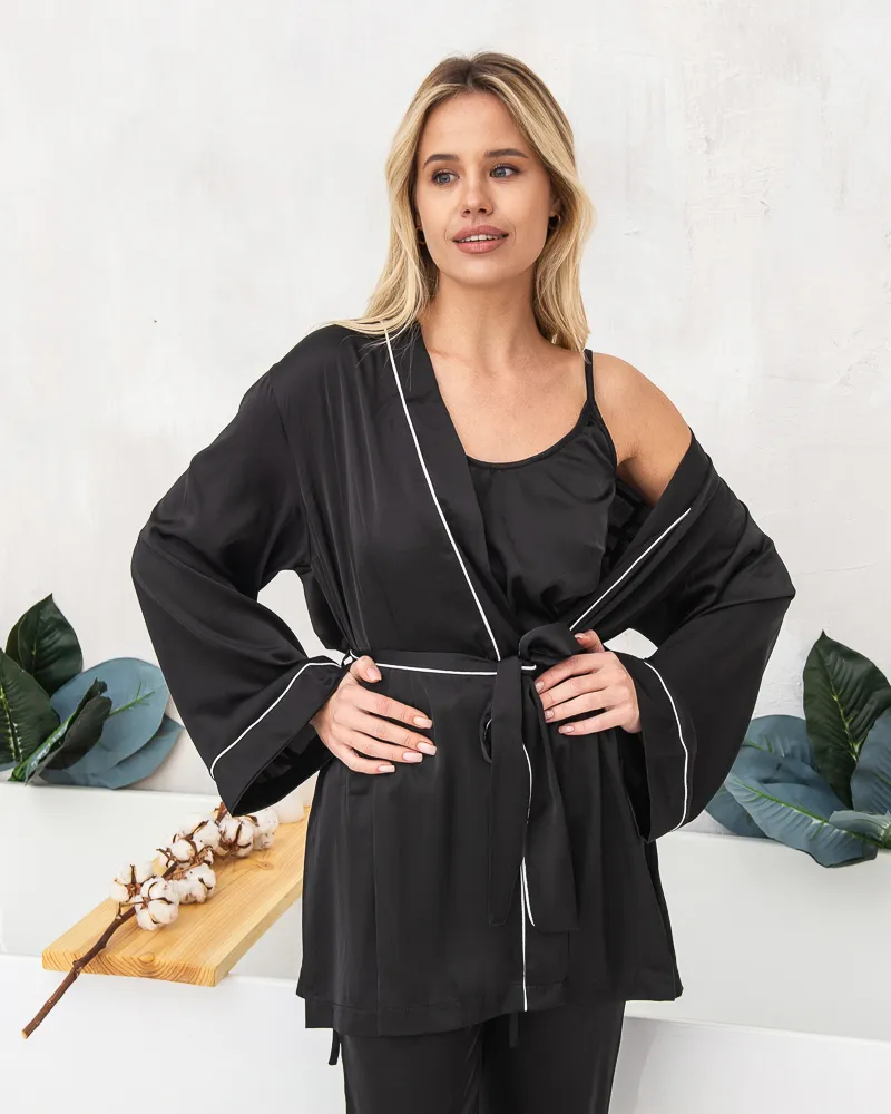 Піжамний костюм четвірка Raya (штани+майка+шорти+халат) з шовку Армані Чорний