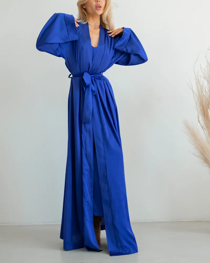 Модель виконана з довгими широкими рукавами та поясом.