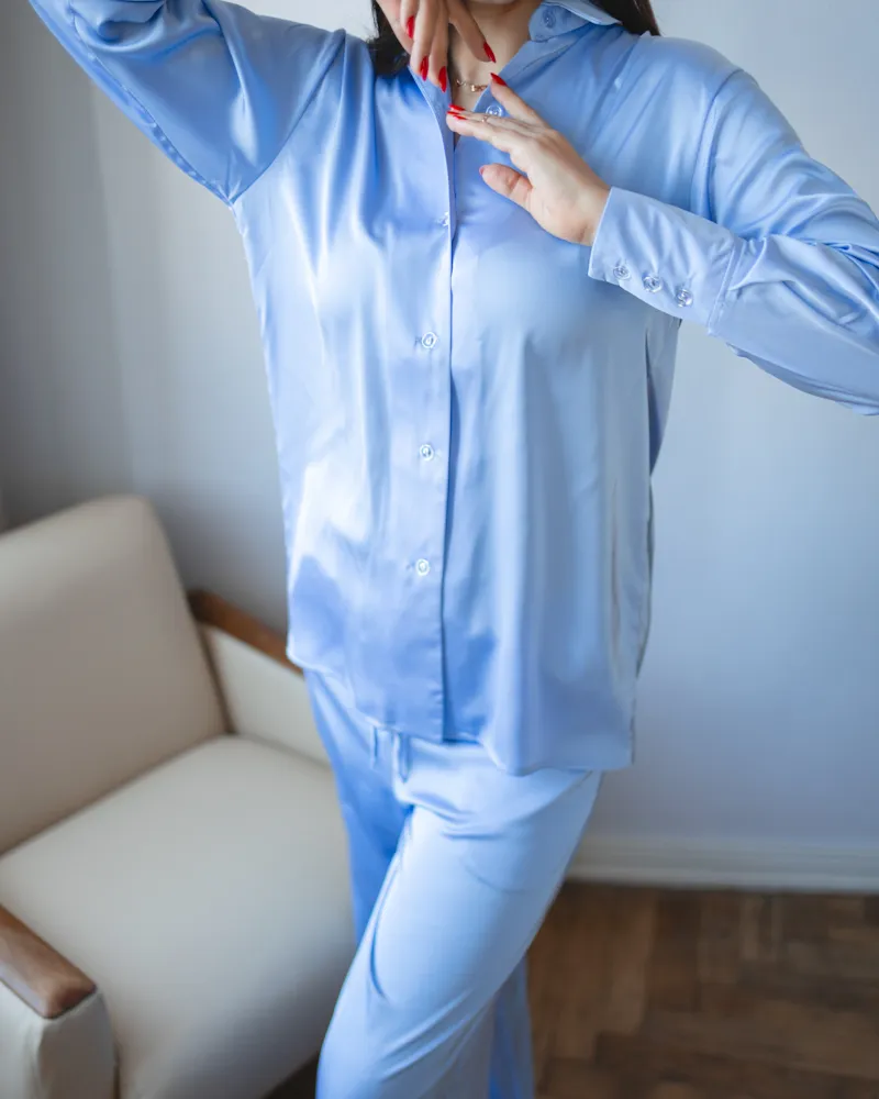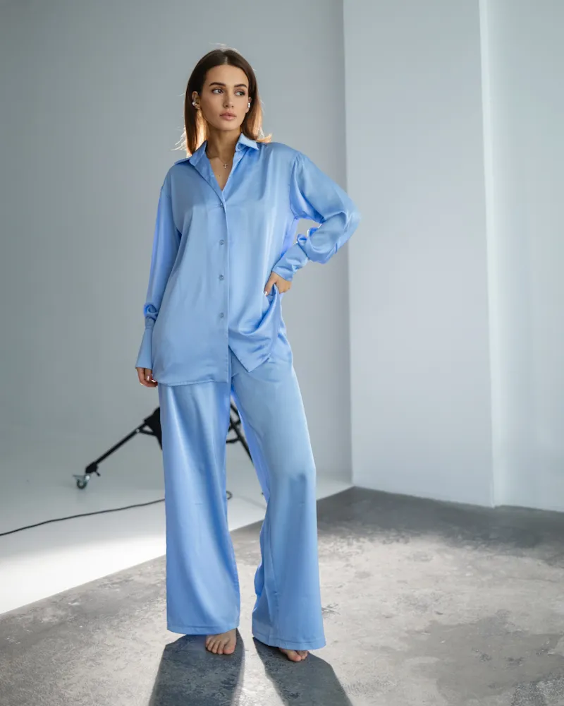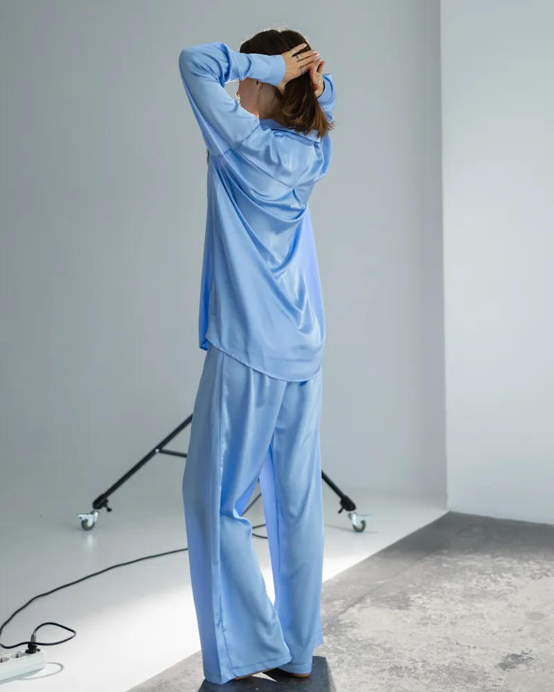 Повітряна сорочка на ґудзиках з високим манжетом та коміром, вільні штани на резинці зі шнурком.