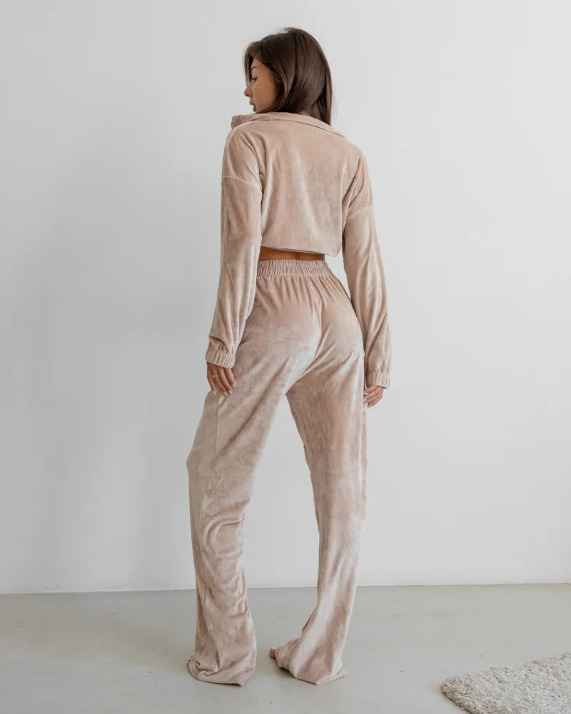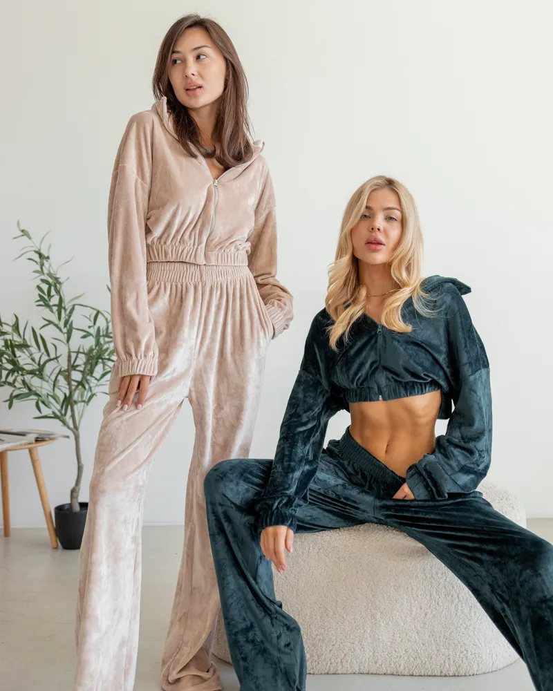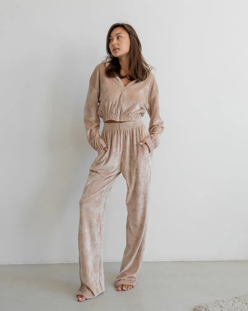 Комплект: укорочена кофтина на блискавці та резинці, штани-палаццо із високою посадкою на резинці.