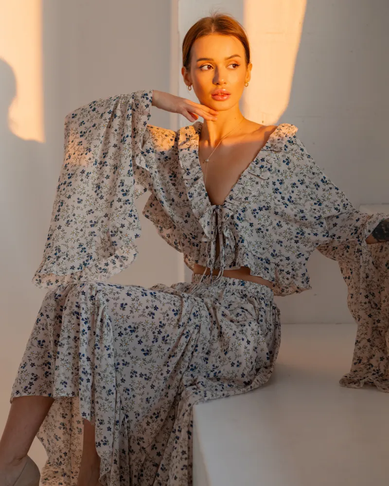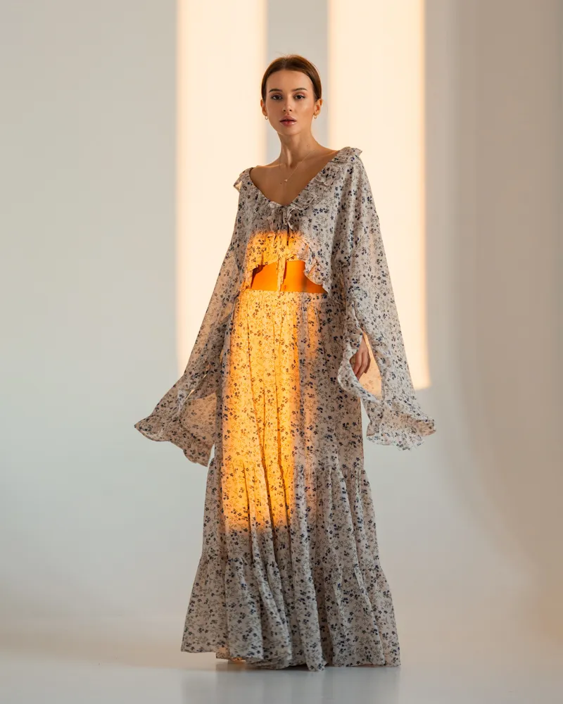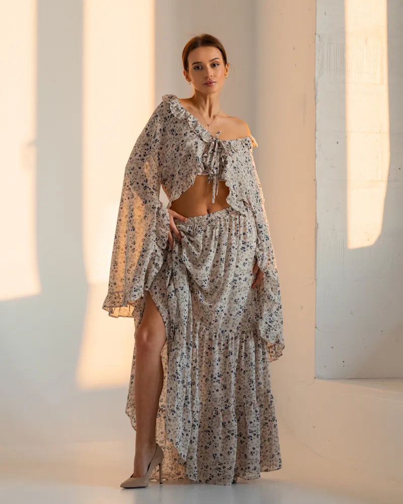 Комплект: коротка блуза з зав'язкою та довгими руквами-кльош і вільна спідниця ярусами в довжині максі. Виріб оздоблений рюшами по всьому краю.