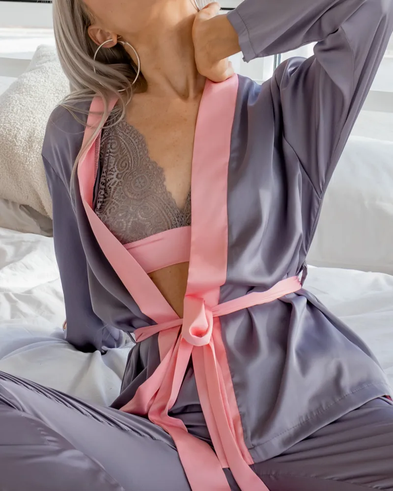 Комплект: витончений мереживний топ, що регулюється, сорочка із поясом та вільні штани на резинці із лампасами.