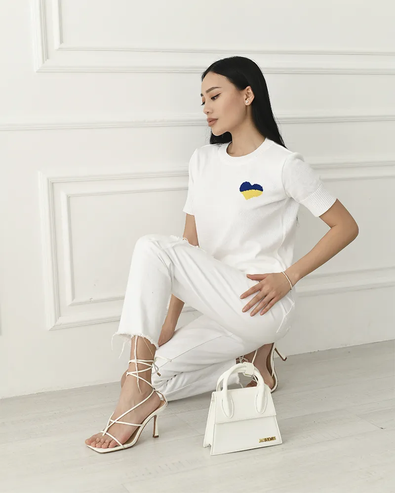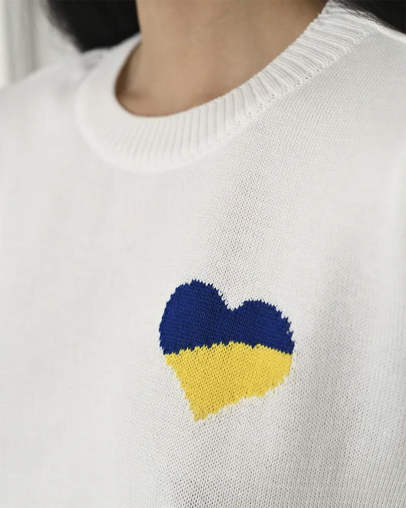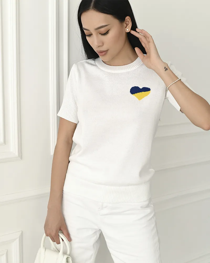 Патріотична футболка із матеріалу в'язка з жовто-блакитним серцем. Виріб м'який та приємний на дотик, добре пропускає повітря.