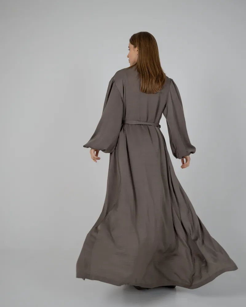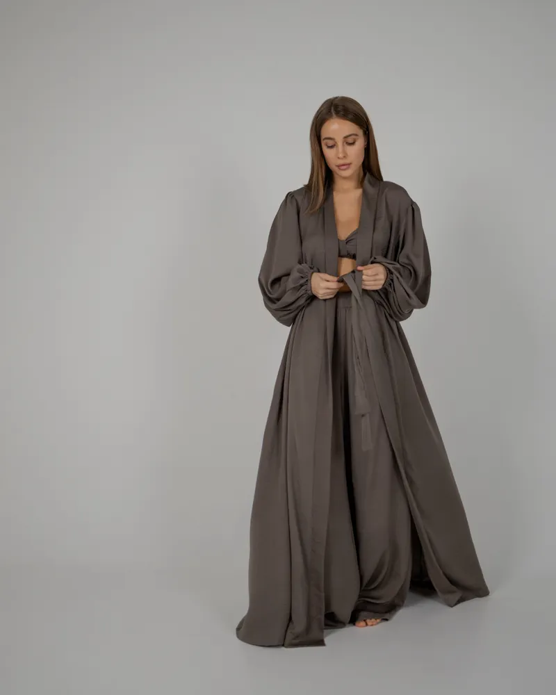 Комплект: довгий халат максі, ліф на застібці без чашечок, є регулятори на бретелях та довгі вільні штани кльош на резинці.